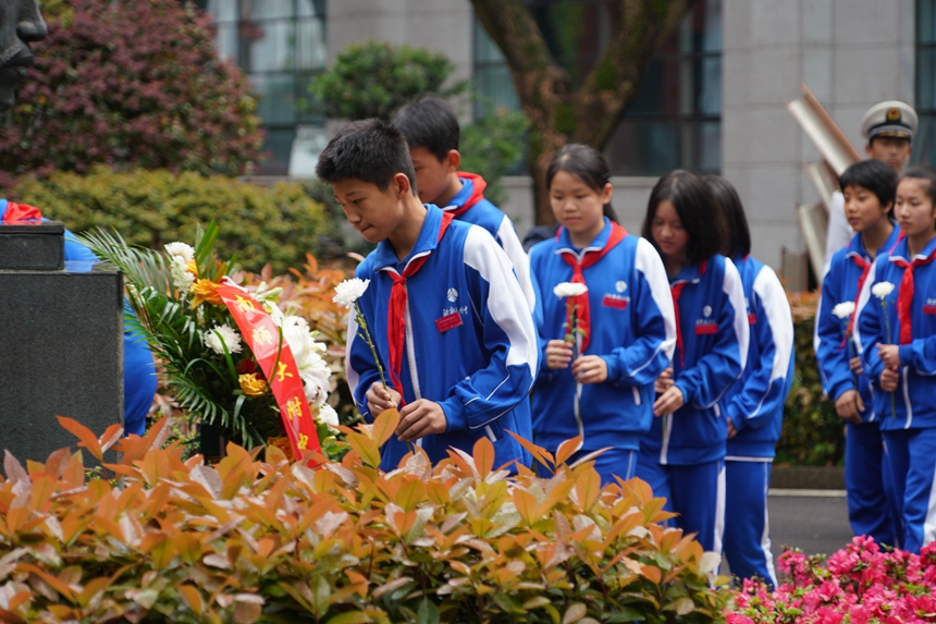 党委书记谢永红、校长黄月初携全体校领导、中层干部、教工团支部以及少先队员、团员代表手捧菊花,肃立于禹之谟先生铜像前,庄严肃立,表达对革命先烈、先师的深切缅怀。