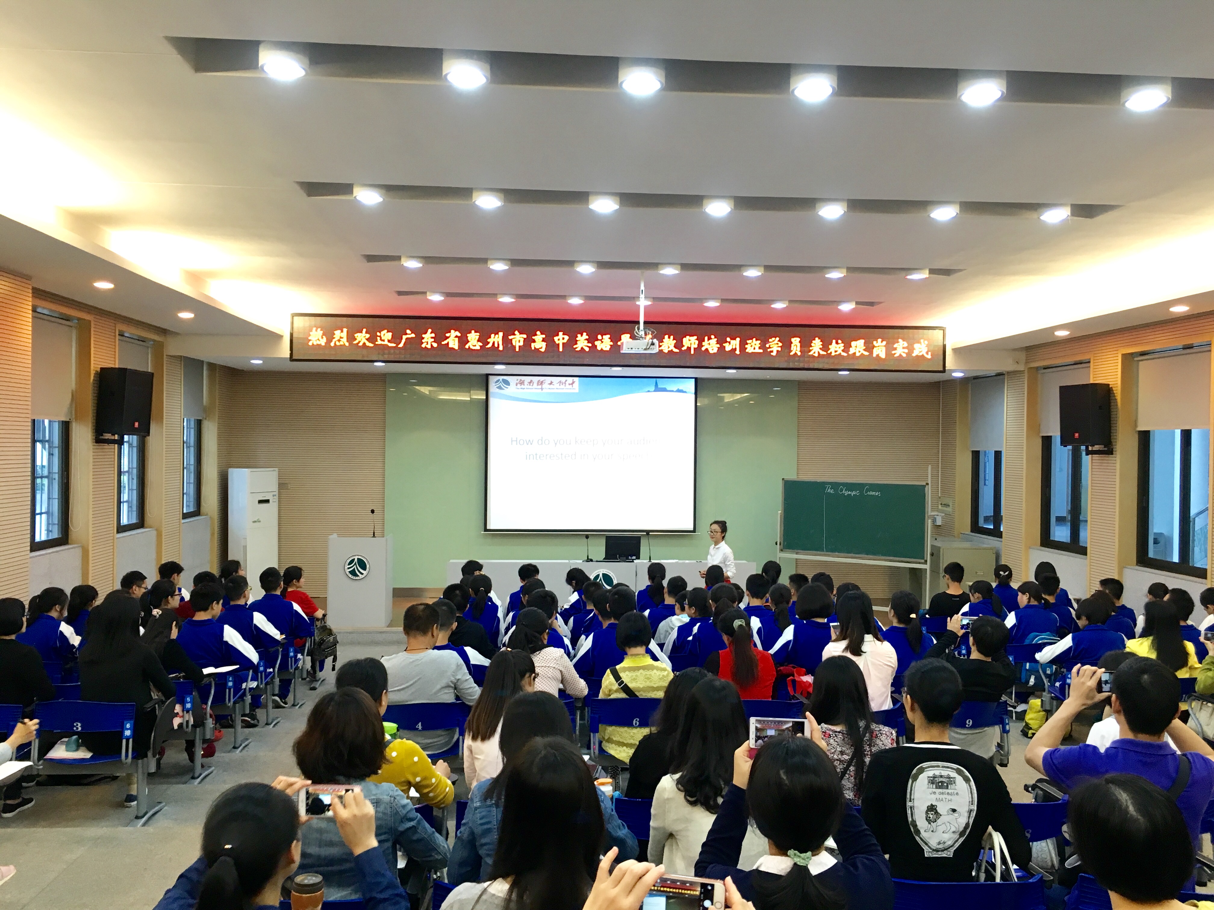2016年5月24日,在我校英语特级教师刘淑英以及湖南师大外国语学院曾永红教授的带领下,广东省惠州市高中英语骨干教师培训班学员一行50多人来我校进行跟岗实践。副校长黄月初接待了学员们,热情欢迎青年骨干教师来我校进行学习交流。上午,在刘淑英老师的主持下,我校在逸夫图书馆学术报告厅举行了欢迎仪式,观看纪录片《荣光》。所有学员与高一备课组英语教师在图书馆前合影留念随后,高一年级英语教师谭莎上了一堂公开课,展示常规课堂的建构和学生活动。刘淑英老师就附中“自主,合作,探究“的教学模式进行了专题讲座,谈到了名师工作室的相关教学经验。附中英语组教研组长尹一兵老师组织了评课活动,老师们愉快而开放地交流了观点。培训班成员高度赞扬了我校英语课堂的科学性和整体性,并对教材、课程安排、课堂设计等细节进行了交流。下午,培训班成员体验了我校英语校本课程,旁听了高一年级杨洁、唐鑫龙、张添老师的兴趣课以及培训课。最后,老师们相互交流了对全面培养学生英语能力,提升学生英语素养方面进行了深入沟通。