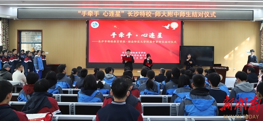 新闻中心 附中新闻 通知公告 最新动态 教育视点 集团学校新闻联播 媒体附中 工作安排 微信附中 【新湖南】这个暖冬,师大附中学子用手语说“爱你” 发布:管理员 来源:未知 日期:2025-12-31 人气:分享到: 新湖南客户端12月31日讯(通讯员 蔡毅 谢小超 张冰洁)12月29日,湖南师大附中校长苏建祥,副校长李智敏携学校行政二党支部党员教师与校学生会全体同学,共赴长沙市特殊教育学校开展两校校际融合结对活动,以“手牵手·心连星”为主题搭建普特交流平台,旨在通过实践互动,促进两校学生间的深度交流与互助成长。 活动伊始,两校学生融合演绎手语舞节目《一路生花》。两校学子用在无声的手势里,传递着同样的信念与对未来的憧憬。 长沙市特殊教育学校党委书记聂兵在发言中,回顾两校合作发展历程,展望未来合作前景,重点阐释了特校 “亲爱精诚” 的校训内涵,并强调学校将持续优化教育服务,助力特殊学生全面发展。 湖南师大附中副校长李智敏深入解读普特融合教育的时代价值,提出 “三个一” 发展愿望,对师大附中学生干部提出具体要求,强调需主动沟通、持续关注,为特殊教育学生提供切实有效的 “结对” 帮扶。 长沙市特殊教育学校副校长、“七彩盒子堆堆计划” 无障碍阅读项目执行总监董艳莎老师,详细介绍了项目具体内容,深入阐释了活动对于推动特殊学生阅读能力提升的重要意义。 湖南师大附中校长苏建祥为长沙市特殊教育学校授“蓝精灵”志愿服务基地牌,并捐赠无障碍阅读书籍。两校还共同签署了党建共建协议,以党建引领深化教育融合,进一步夯实两校合作基础。 结对仪式后,两校学子互赠礼物。师大附中的同学们按心愿清单,送上新年礼物。特殊教育学校学生则以自制手工艺品、毛绒玩偶等作为回赠。 长沙市特殊教育学校高中部小周同学是一名热爱田径的少年,虽然听力存在缺陷,但从未放弃对生活的热爱。他的结对伙伴师大附中学生干部谭逸轩、李嘉涛悄悄为他准备了专业田径用品。在现场交换礼物环节,小周收到礼物后非常激动,连连做出“我爱你”“好朋友”的手势。师大附中的同学们非常感动,也学着手语老师的样子,在无声中说着“爱你”,在寒冬里传递温暖。 仪式结束后,师大附中行政二党支部的党员教师在特殊教育学校领导陪同下,参观校园,深化党员担当、共谋未来发展。 学生们则前往抱抱咖啡综合实训基地,有序开展特普融合实践课堂,现磨咖啡制作、挂耳咖啡包制作、杯蜡制作三大特色实践课程同步进行。两校学子手握着手,携手完成作品。阵阵咖啡香里,两校学子的情谊在无声中升华,现场处处涌动“真棒”“好朋友”“我爱你”手语动作。 活动结束后,两校学子手拉着手,做好约定,以后要长期交流。特校的视障学生小刘同学悄悄贴近他结对的伙伴——师大附中学生聂梓滕,说了句“今天我很开心!我很爱你”。 这个冬天,附中学子们通过手语、行动展示心底热烈的爱,赠予这群同龄人最宝贵的礼物。 据悉,本次活动是湖南师大附中德育与学生处、团委组织的领英课程系列活动之一,是行政二党支部“一月一课一片一实践”的新平台,亦是一次鲜活的融合教育实践。它为附中学子提供了接近社会,服务社会、践行“公勤仁勇”校训中仁爱之心的宝贵机会,也是师大附中学生干部领英团队“担当青春使命”誓言的生动展示、附中“以人为本,兼容并蓄”育人理念的生动实践。组稿:袁小玲 原文链接:https://m.voc.com.cn/xhn/news/202512/31255724.html 上一篇:【红网】全国仅四席,湖南师大附中两学子成功跻身生物奥赛国家队 下一篇:【潇湘晨报】寒假在即,湖南师大附中送的“礼”里有师德提醒 通知公告 更多 关于征集湖南师大附中“十五五” 湖南师范大学附属中学网站及网络 湖南师范大学附属中学2026年公开 关于开展2026年寒假教科研论文评 湖南师范大学附属中学2026年公开 2026年省级“送培到校”——湖南 最新动态 更多