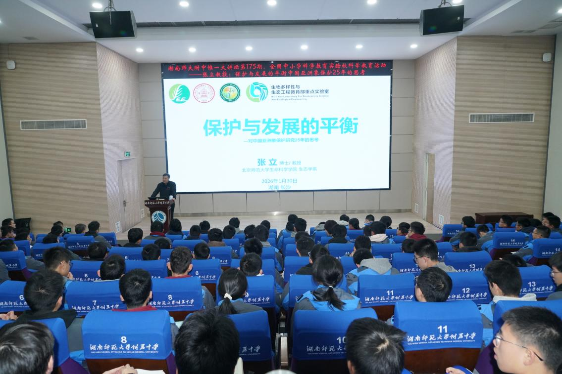 1月30日,湖南师大附中惟一大讲坛第175期暨全国中小学科学教育实验校科学教育活动在桃子湖校区惟一大讲堂举行。北京师范大学生态学教授、博士生导师张立应邀带来题为《保护与发展的平衡:中国亚洲象保护25年的思考》的专题讲座,湖南师大附中师生、附中教育集团师生及全国中小学科学教育实验校部分师生共同聆听了这场生态科普盛宴。