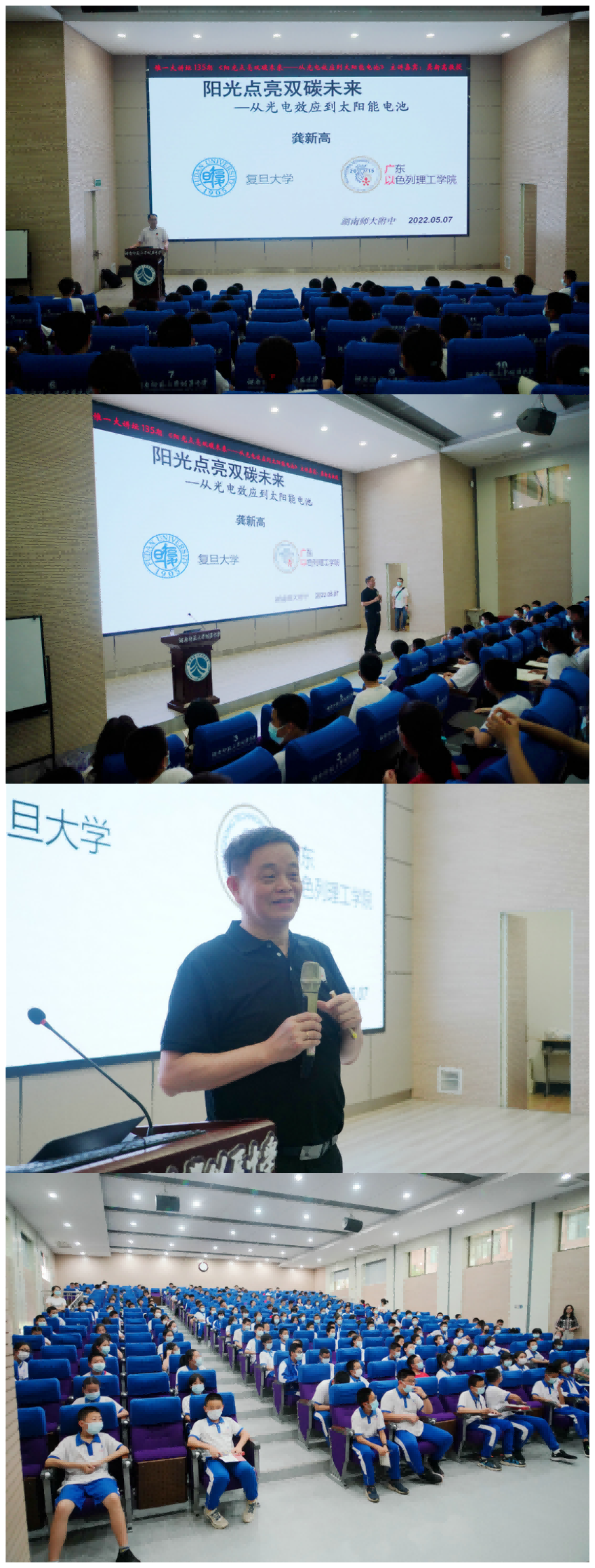2022年5月7日星期六下午,我校惟一大讲坛135期在学校会议厅进行,湖南师大杰出校友、中国科学院院士龚新高教授担任本期论坛主讲嘉宾,他以《阳光点亮双碳未来——从光电效应到太阳能电池》为题给高一年级和七年级学生带来了一场精彩的讲座。