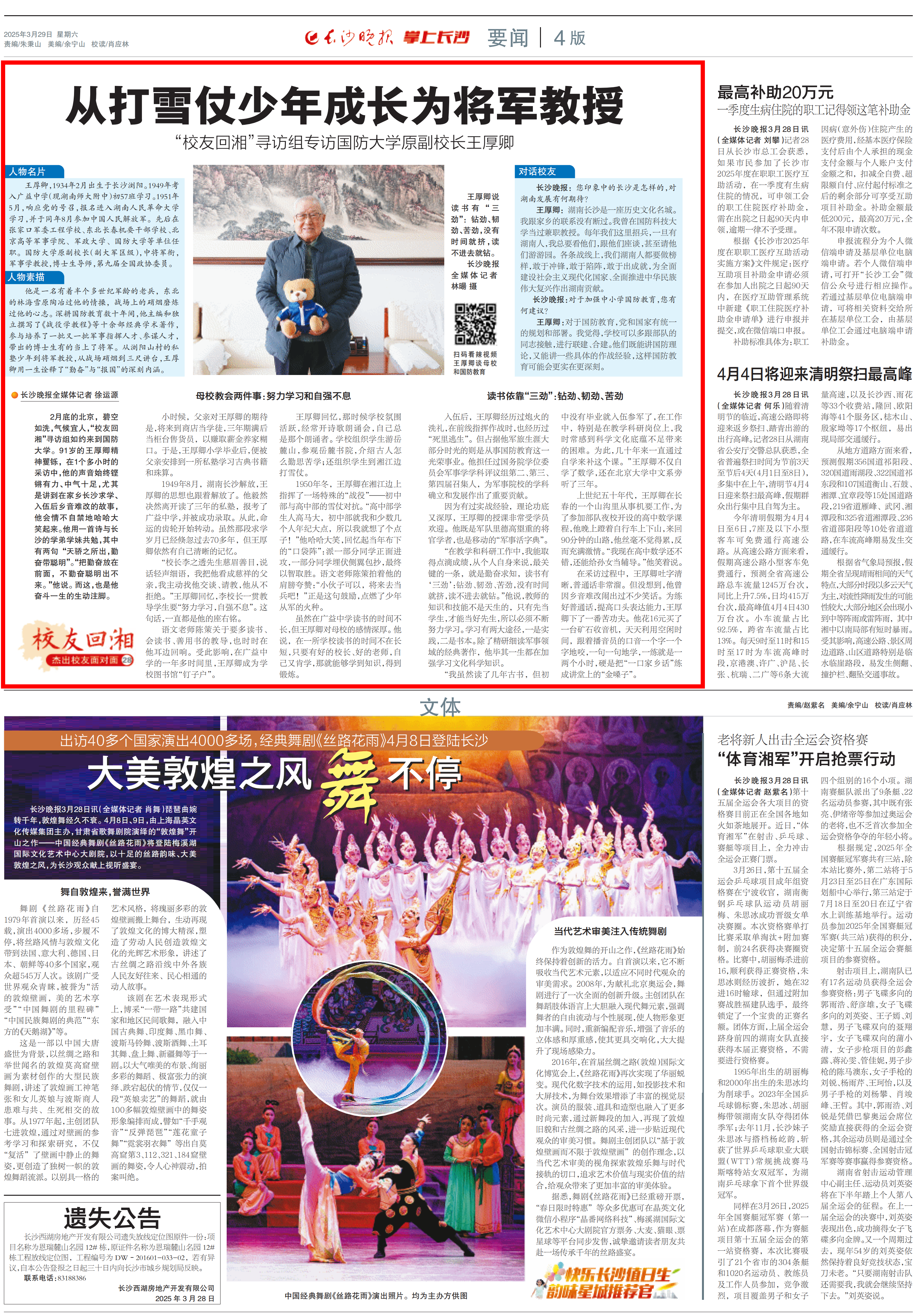 2月底的北京,碧空如洗,气候宜人,“校友回湘”寻访组如约来到国防大学。91岁的王厚卿精神矍铄,在1个多小时的采访中,他的声音始终铿锵有力、中气十足,尤其是讲到在家乡长沙求学、入伍后乡音难改的故事,他会情不自禁地哈哈大笑起来。他用一首诗与长沙的学弟学妹共勉,其中有两句“天骄之所出,勤奋带聪明”。“把勤奋放在前面,不勤奋聪明出不来。”他说。而这,也是他奋斗一生的生动注脚。