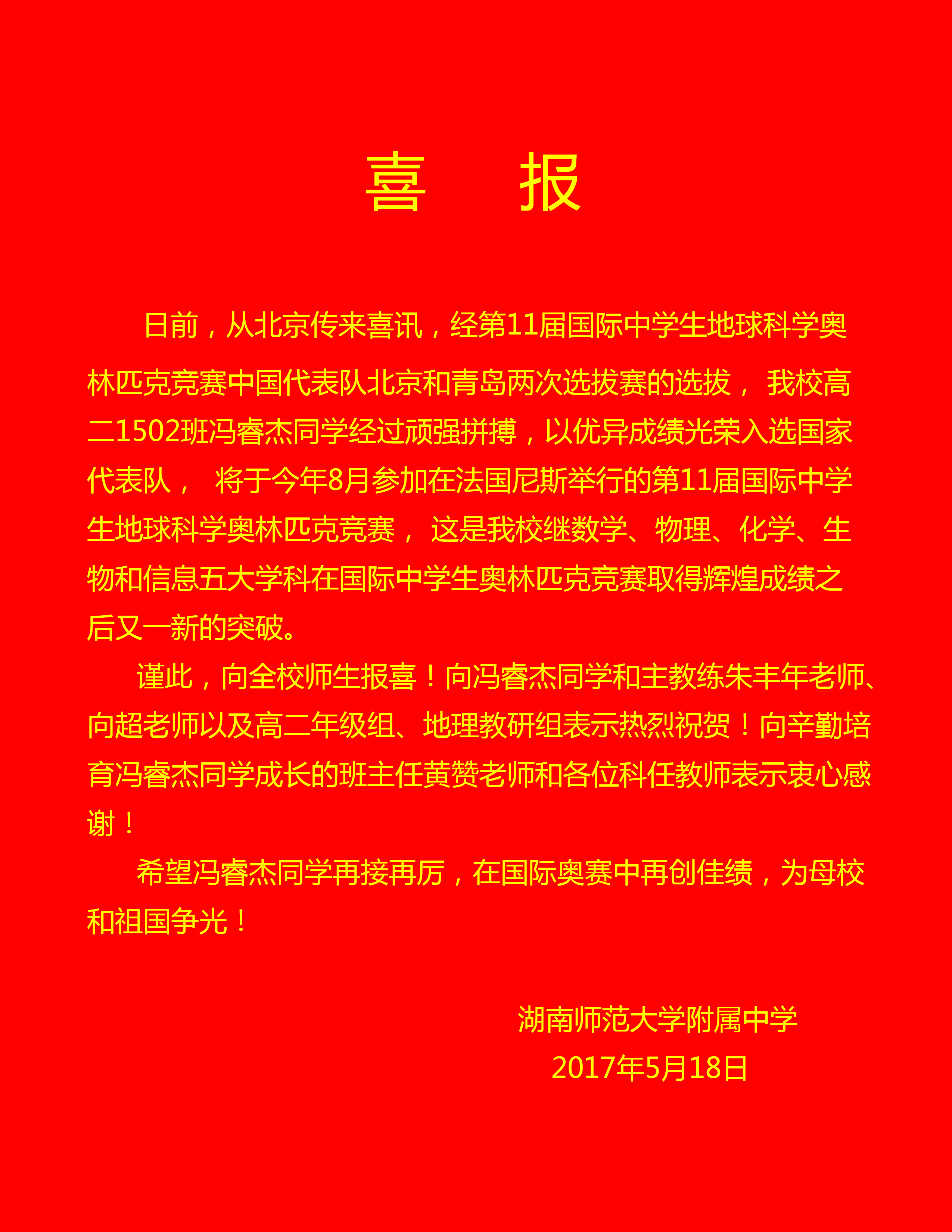 喜报:冯睿杰同学光荣入选中学生地球科学奥林匹克竞赛国家代表队