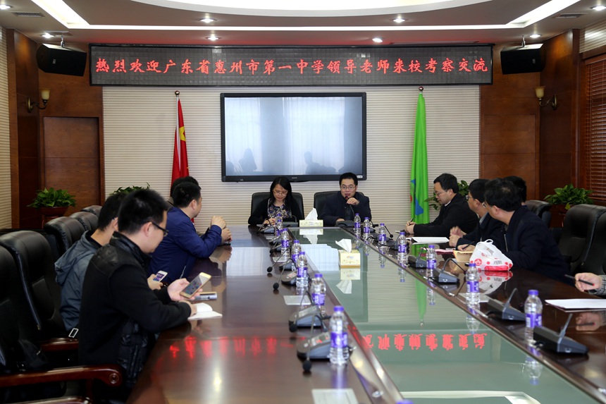 新闻中心 附中新闻 通知公告 最新动态 教育视点 集团学校新闻联播 媒体附中 工作安排 微信附中 广东省惠州市第一中学领导老师来校考察交流 发布:校办公室 来源:校办公室 日期:2018-03-26 人气:分享到: 3月26日上午,广东省惠州市第一中学副校长李海媚带领高一年级教师一行12人来我校考察交流。校长助理兼科技创新处主任蔡任湘热情接待了客人们。 在校史馆会议室,蔡任湘向来宾介绍了我校的办学历程与办学特色,并就拔尖学生培养及学科竞赛的指导工作与来宾们进行了座谈交流。 随后,高一年级组组长李勇和高一年级学科奥赛教练同来宾们就具体竞赛教学及培训进行了深入探讨和交流。 校办公室主任莫晖参与了接待工作。 (撰稿:周瑶涵 审稿:莫晖) 上一篇:学校召开2017-2018学年度家长委员会第二次全体会议 下一篇:真情常在 爱心无价——民盟湖南师大附中为“脑瘫村”儿童献爱心活动 通知公告 更多 关于征集湖南师大附中“十五五” 湖南师大附中2026年教师招聘(第 湖南师大附中2025年教育教学成果 湖南师范大学附属中学2025年零星 关于举办第40届校园文化艺术节的 湖南师范大学附属中学2026年教师 最新动态 更多