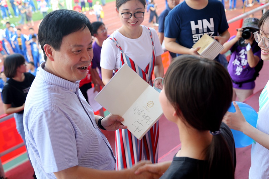 接下来,微笑传递游戏中,游戏中的“输家”在登上主席台准备接受惩罚时,却收获了由谢永红校长亲自颁发的签名祝福本,心情大反转,正如看似不美好的事情,只要拐个角,说不定就会有惊喜。