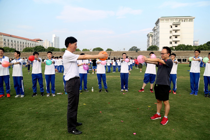 “捏捏你的肩呀,一起来锻炼呀!捶捶你的背呀,就你最有味呀;摸摸你的头呀,头上有点油呀!摸摸你的头呀,今年你最牛呀……”在主持人幽默风趣、热情四射的引导下,同学们为站在自己前方的同学做“阳光SPA”,操场上顿时炸开了锅,嬉戏欢笑声一片。