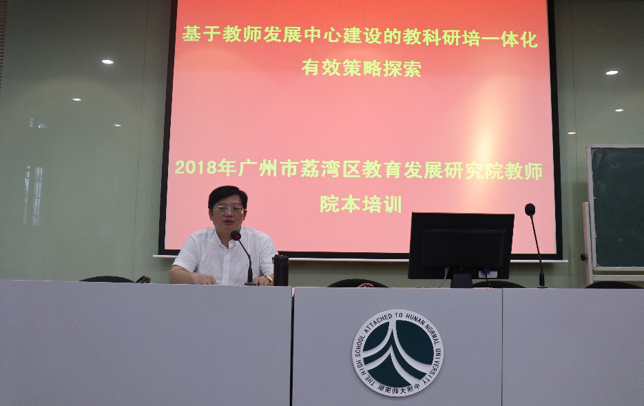 新闻中心 附中新闻 通知公告 最新动态 教育视点 集团学校新闻联播 媒体附中 工作安排 微信附中 广东省广州市荔湾区教育发展研究教师院本培训班学员来校考察交流 发布:校办公室 来源:科研与教师发展处 日期:2018-09-02 人气:分享到: 2018年8月29日,广东省广州市荔湾区教育发展研究院教师院本培训班的63位学员来我校进行考察交流,本次培训围绕基于教师发展中心建设的教科研培一体化有效策略探索的主题,在湖南省教师发展中的承接下,展开了一系列的学习研讨活动。考察队伍由华南师范大学基础教育培训与研究院培训部朱富生副主任和蔡倩颖老师带队,湖南省中小学教师发展中心师德建设与师资培养科彭志波老师陪同对接。我校党委书记黄月初、校办公室主任莫晖、科研与教师发展处主任刘进球盛情接待。 莫晖带领考察团队欣赏了校园风光,介绍了我校的历史人文与发展规划,阐释了办学理念和教学特色。随后,黄月初为来访团队基于中学校本科研的实践与思考开展了一场深入的研讨交流会,他强调教育科研是体验成长的职业,并以我校实例为切入口,指导大家熟悉教育科研的程序,了解教育科研的工具,培养教育科研的能力,让来访学者们既真实感受到了百年名校的文化底蕴,又切实体会到了研究型高中建设的风貌,将教育穿越,使教育跨界! (供稿人 周鹏之) 上一篇:向下生根, 向上发芽——湖南师大附中2018级高一新生军训检阅暨表彰大会 下一篇:学校召开新学年开学工作会议 通知公告 更多 关于征集湖南师大附中“十五五” 湖南师大附中2026年教师招聘(第 湖南师大附中2025年教育教学成果 湖南师范大学附属中学2025年零星 关于举办第40届校园文化艺术节的 湖南师范大学附属中学2026年教师 最新动态 更多