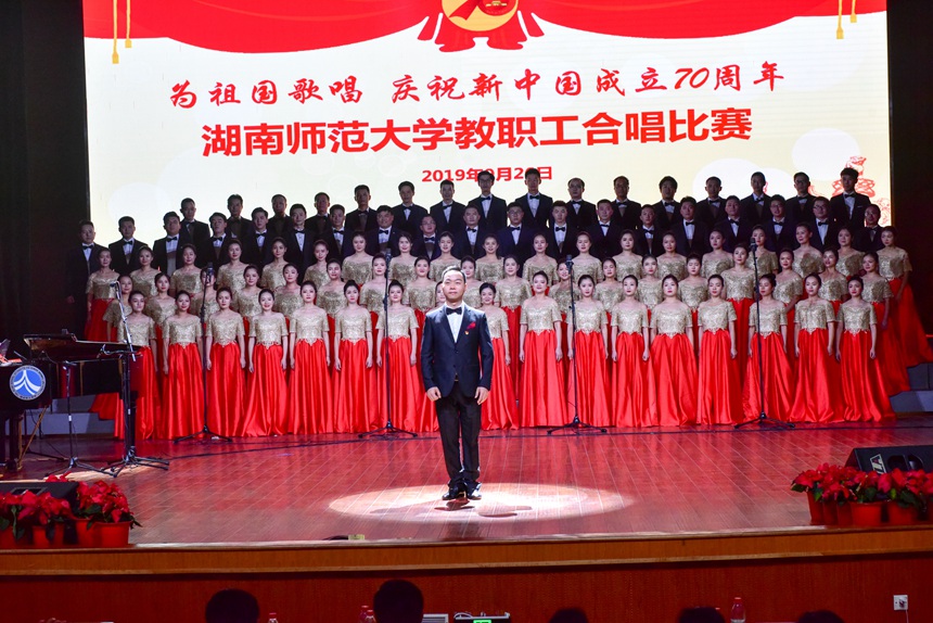 新闻中心 附中新闻 通知公告 最新动态 教育视点 集团学校新闻联播 媒体附中 工作安排 微信附中 国庆合唱赞歌嘹亮 师大附中独占鳌头——我校教职工合唱团荣获湖南师大庆祝新中国成立70周年教职工合唱比赛第一名 发布:管理员 来源:工会 日期:2019-09-27 人气:分享到: 9月26日下午,秋高气爽,丹桂飘香。在国庆节即将到来之际,湖南师范大学在我校活动中心隆重举行了“为祖国歌唱——庆祝新中国成立70周年”教职工合唱比赛。32支参赛队伍热情洋溢,歌声嘹亮,用真心和热情讴歌中华民族实现伟大复兴中国梦的奋斗历程。由学校党政工倾情参与的我校教职工合唱团众志成城,气贯长虹,完美演绎了《在灿烂的阳光下》,以10.868的最高分勇夺合唱比赛一等奖第一名,赢得了专家评委的高度赞扬和观众的阵阵掌声。 (撰稿 谢朝春 审稿 谭伟) 上一篇:学校启动2016级师范类本科生教育教学实习工作 下一篇:学校举行2019年省规划课题、协会课题开题论证报告会 通知公告 更多 关于征集湖南师大附中“十五五” 湖南师大附中2026年教师招聘(第 湖南师大附中2025年教育教学成果 湖南师范大学附属中学2025年零星 关于举办第40届校园文化艺术节的 湖南师范大学附属中学2026年教师 最新动态 更多