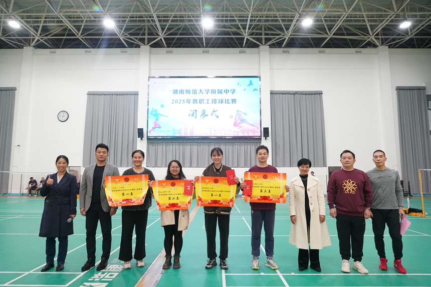新闻中心 附中新闻 通知公告 最新动态 教育视点 集团学校新闻联播 媒体附中 工作安排 微信附中 凝聚师魂“排”出精彩——我校2025年教职工排球赛圆满闭幕 发布:管理员 来源:未知 日期:2025-10-28 人气:分享到: 经过连日紧张而精彩的比拼,2025年教职工排球赛于10月27日圆满落下帷幕。闭幕式在庄严的国歌与校歌声中正式开始。纪检书记李春莲,副校长兼工会主席廖强,副校长李智敏出席闭幕式。闭幕式由体育工会体育委员汤彬老师主持。 最终,行政一、二联队与教研联工会组并列冠军,摘得桂冠;行政三与初中部联队夺得亚军;高二年级工会组将季军收入囊中。高一年级工会组、高三年级工会组和大泽湖工会组因出色的组织表现,荣获优秀组织奖。 校领导依次为获奖队伍颁发了优秀组织奖、第三名、第二名及冠军奖项。廖主席宣布,2025年教职工排球赛胜利闭幕!全场响起持久而热烈的掌声。所有获奖队伍代表、裁判员、工作人员及校领导共同合影留念,记录下这荣耀与欢聚的时刻。 比赛有终场,奋斗无终点。此次排球赛不仅丰富了教职工的业余生活,更增强了团队凝聚力,展现了附中人团结协作、勇于拼搏的精神风貌。 上一篇:我校运动健儿省中运会斩获6金11银4铜,羽毛球勇夺双第一 下一篇:英国文化日在我校精彩上演 通知公告 更多 关于开展第六届湖南省教育科学研 结束巡察公告 湖南师范大学附属中学大泽湖校区 2026年报刊征订通知 湖南师大附中关于开展2025年教师 湖南师范大学附属中学2025年至2 最新动态 更多
