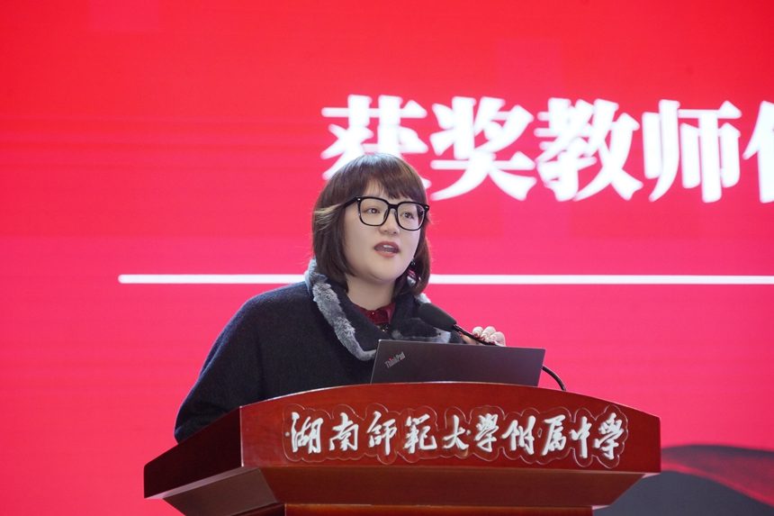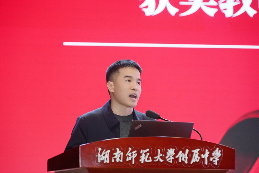 副校长廖强宣读《关于2025年度教育教学成果奖的表彰决定》。大会依次为高 2025 届教育教学成果奖、高2023 级教育教学成果奖、初2025届教育教学成果奖、学科竞赛指导奖优秀代表、优秀课题奖及“陶步农・健帆”奖教奖获得者颁奖。黄钢、严志、陈婕、李艳四位获奖教师代表依次上台发言,分享了教学心得与育人感悟。