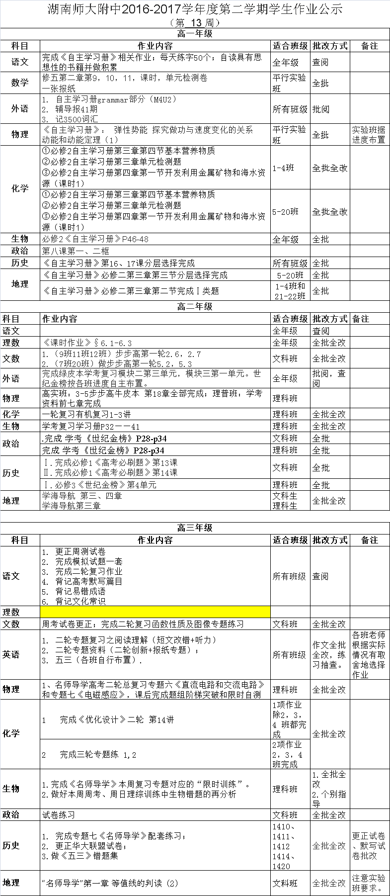 课程建设 教学资讯 课堂教学 学科竞赛 作业公示 校本课程 高考专栏 2016-2017学年度第二学期学生作业公示 (第13周) 发布:教学与课程处 来源:未知 日期:2017-05-11 人气:分享到: 上一篇:2016-2017学年度第二学期学生作业公示 (第12周) 下一篇:2016-2017学年度第二学期学生作业公示 (第14周) 通知公告 更多 湖南师大附中2025-2026学年度第一学 湖南师范大学附属中学2025级新生 湖南师范大学附属中学大泽湖校区 2025年湖南省基础教育教学成果奖 湖南省教育厅关于开展2025年湖南 湖南师范大学附属中学2025级新生 最新动态 更多