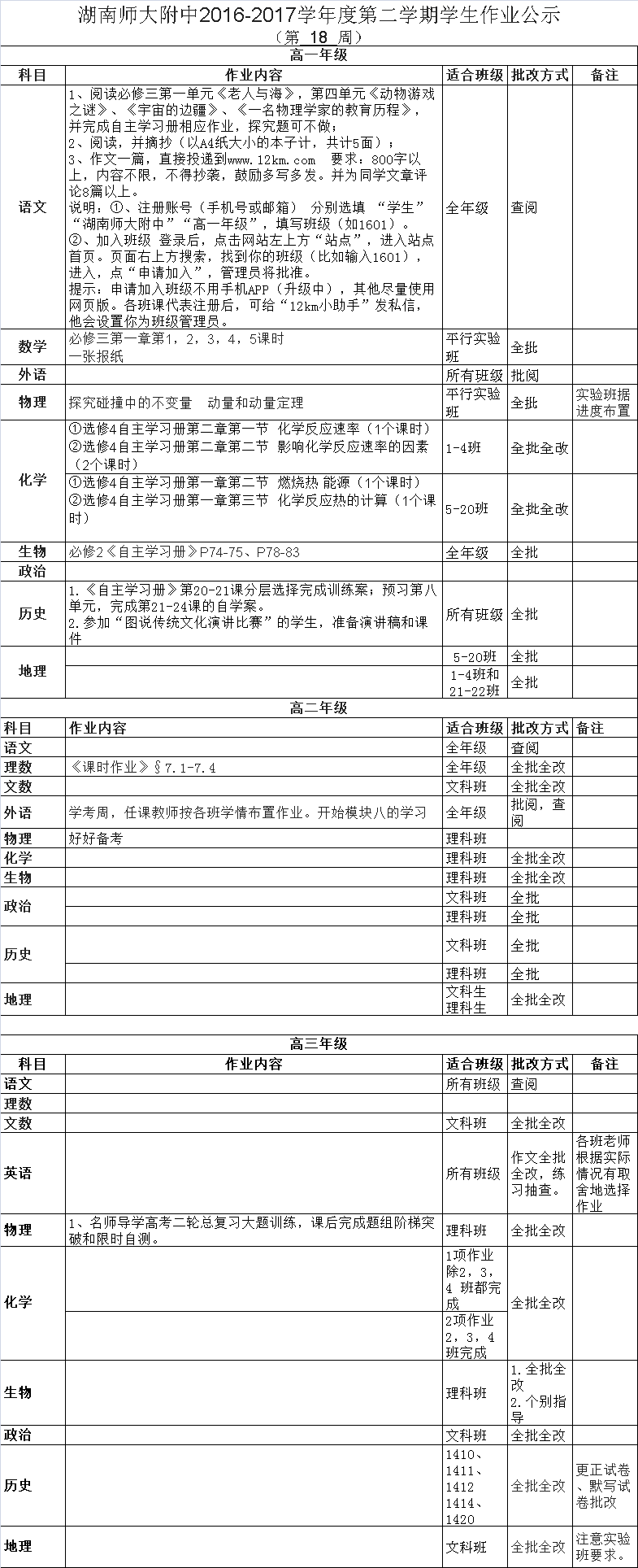 课程建设 教学资讯 课堂教学 学科竞赛 作业公示 校本课程 高考专栏 2016-2017学年度第二学期学生作业公示 (第18周) 发布:教学与课程处 来源:未知 日期:2017-06-14 人气:分享到: 上一篇:2016-2017学年度第二学期学生作业公示 (第17周) 下一篇:2016-2017学年度第二学期学生作业公示 (第19周) 通知公告 更多 湖南师大附中2025-2026学年度第一学 湖南师范大学附属中学2025级新生 湖南师范大学附属中学大泽湖校区 2025年湖南省基础教育教学成果奖 湖南省教育厅关于开展2025年湖南 湖南师范大学附属中学2025级新生 最新动态 更多
