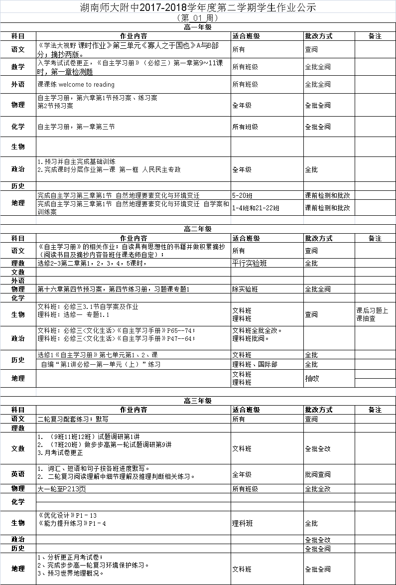 课程建设 教学资讯 课堂教学 学科竞赛 作业公示 校本课程 高考专栏 17-18-2学生作业公示(第01周) 发布:课程与教学处 来源:未知 日期:2018-03-15 人气:分享到: 上一篇:17-18-1学生作业公示(第11周) 下一篇:17-18-2学生作业公示(第02周) 通知公告 更多 湖南师范大学附属中学2025年第二 湖南师范大学附属中学2025年教师 关于开展“科研优秀奖”评选活动 湖南师大附中2025-2026学年度第一学 湖南师范大学附属中学2025级新生 湖南师范大学附属中学大泽湖校区 最新动态 更多
