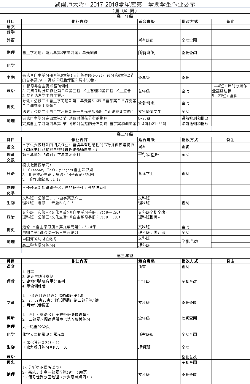 课程建设 教学资讯 课堂教学 学科竞赛 作业公示 校本课程 高考专栏 17-18-2学生作业公示(第04周) 发布:课程与教学处 来源:未知 日期:2018-03-28 人气:分享到: 上一篇:17-18-2学生作业公示(第03周) 下一篇:17-18-2学生作业公示(第05周) 通知公告 更多 湖南师范大学附属中学2025年第二 湖南师范大学附属中学2025年教师 关于开展“科研优秀奖”评选活动 湖南师大附中2025-2026学年度第一学 湖南师范大学附属中学2025级新生 湖南师范大学附属中学大泽湖校区 最新动态 更多