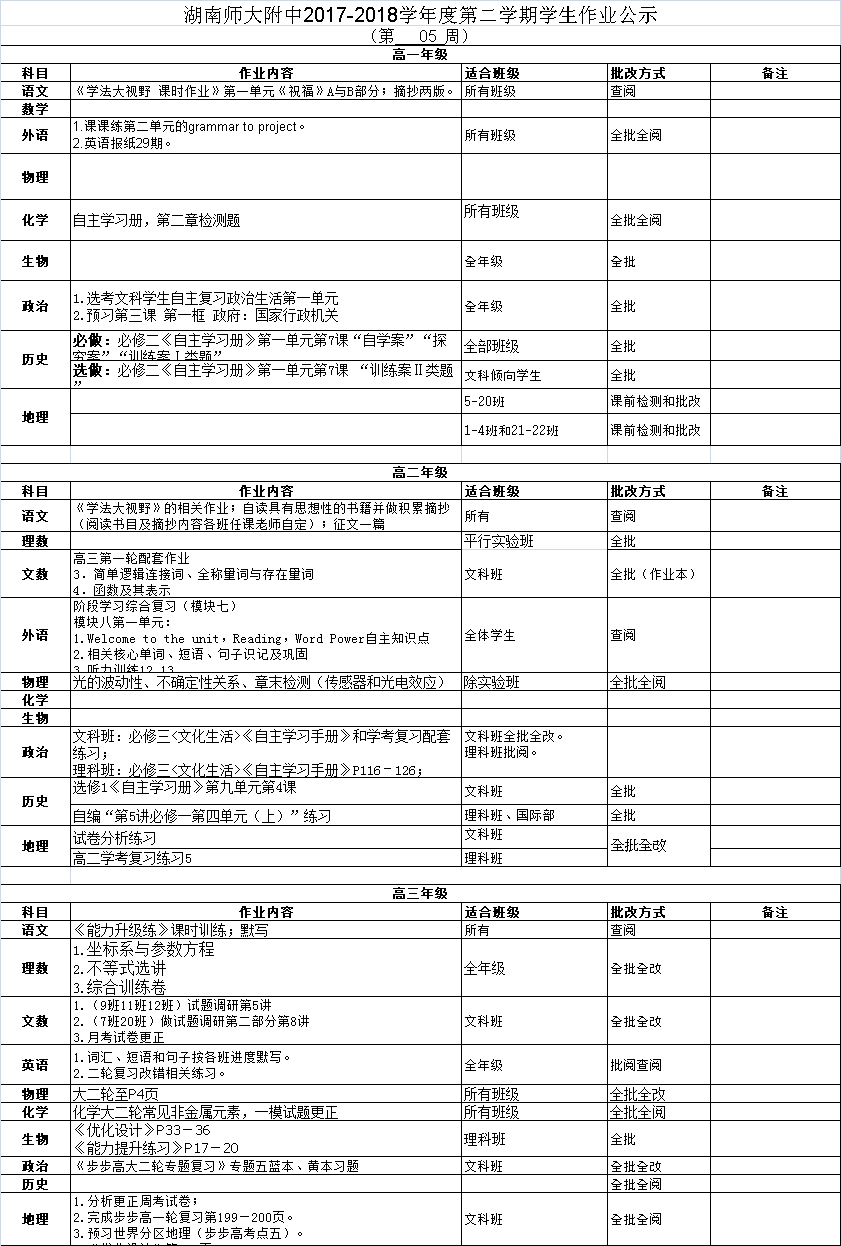 课程建设 教学资讯 课堂教学 学科竞赛 作业公示 校本课程 高考专栏 17-18-2学生作业公示(第05周) 发布:课程与教学处 来源:未知 日期:2018-05-08 人气:分享到: 上一篇:17-18-2学生作业公示(第04周) 下一篇:17-18-2学生作业公示(第06周) 通知公告 更多 湖南师范大学附属中学2025年第二 湖南师范大学附属中学2025年教师 关于开展“科研优秀奖”评选活动 湖南师大附中2025-2026学年度第一学 湖南师范大学附属中学2025级新生 湖南师范大学附属中学大泽湖校区 最新动态 更多