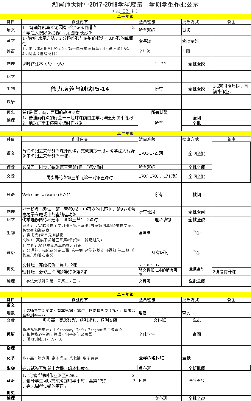 课程建设 教学资讯 课堂教学 学科竞赛 作业公示 校本课程 高考专栏 18-19-1学生作业公示(第02周) 发布:课程与教学处 来源:课程与教学处 日期:2018-09-12 人气:分享到: 上一篇:17-18-2学生作业公示(第09周) 下一篇:17-18-2学生作业公示(第10周) 通知公告 更多 湖南师大附中2025-2026学年度第一学 湖南师范大学附属中学2025级新生 湖南师范大学附属中学大泽湖校区 2025年湖南省基础教育教学成果奖 湖南省教育厅关于开展2025年湖南 湖南师范大学附属中学2025级新生 最新动态 更多