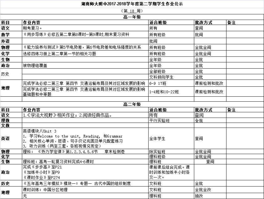 课程建设 教学资讯 课堂教学 学科竞赛 作业公示 校本课程 高考专栏 17-18-2学生作业公示(第18周) 发布:课程与教学处 来源:课程与教学处 日期:2018-07-02 人气:分享到: 上一篇:17-18-2学生作业公示(第17周) 下一篇:17-18-2学生作业公示(第19周) 通知公告 更多 湖南师范大学附属中学2025年第二 湖南师范大学附属中学2025年教师 关于开展“科研优秀奖”评选活动 湖南师大附中2025-2026学年度第一学 湖南师范大学附属中学2025级新生 湖南师范大学附属中学大泽湖校区 最新动态 更多