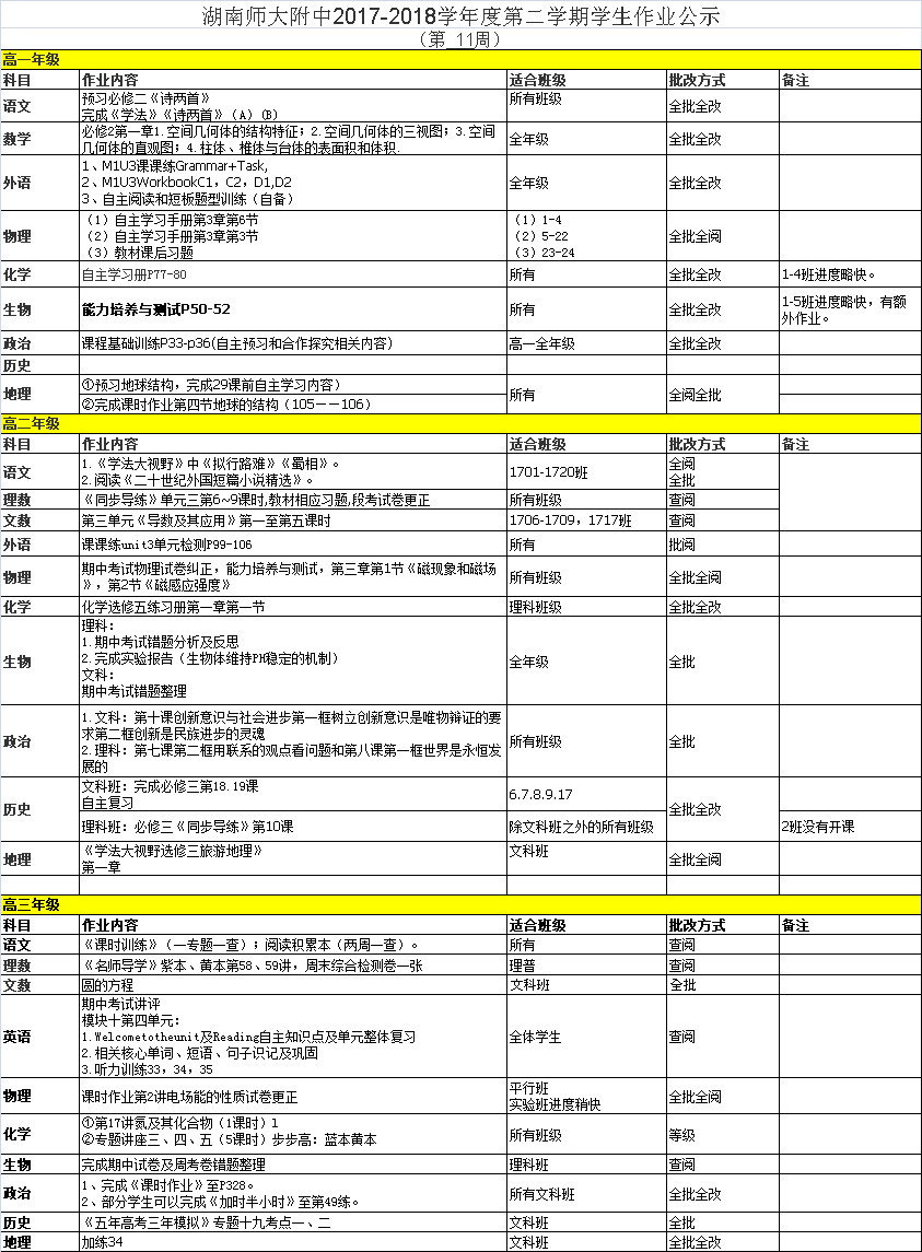 课程建设 教学资讯 课堂教学 学科竞赛 作业公示 校本课程 高考专栏 18-19-1学生作业公示(第11周) 发布:课程与教学处 来源:未知 日期:2018-11-19 人气:分享到: 上一篇:18-19-1学生作业公示(第10周) 下一篇:18-19-1学生作业公示(第12周) 通知公告 更多 关于征集湖南师大附中“十五五” 湖南师大附中2026年教师招聘(第 湖南师大附中2025年教育教学成果 湖南师范大学附属中学2025年零星 关于举办第40届校园文化艺术节的 湖南师范大学附属中学2026年教师 最新动态 更多