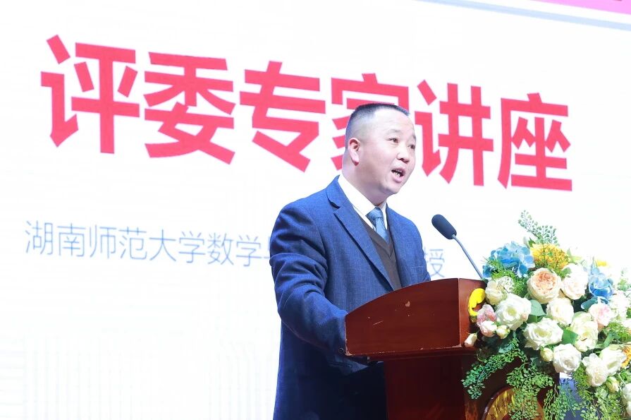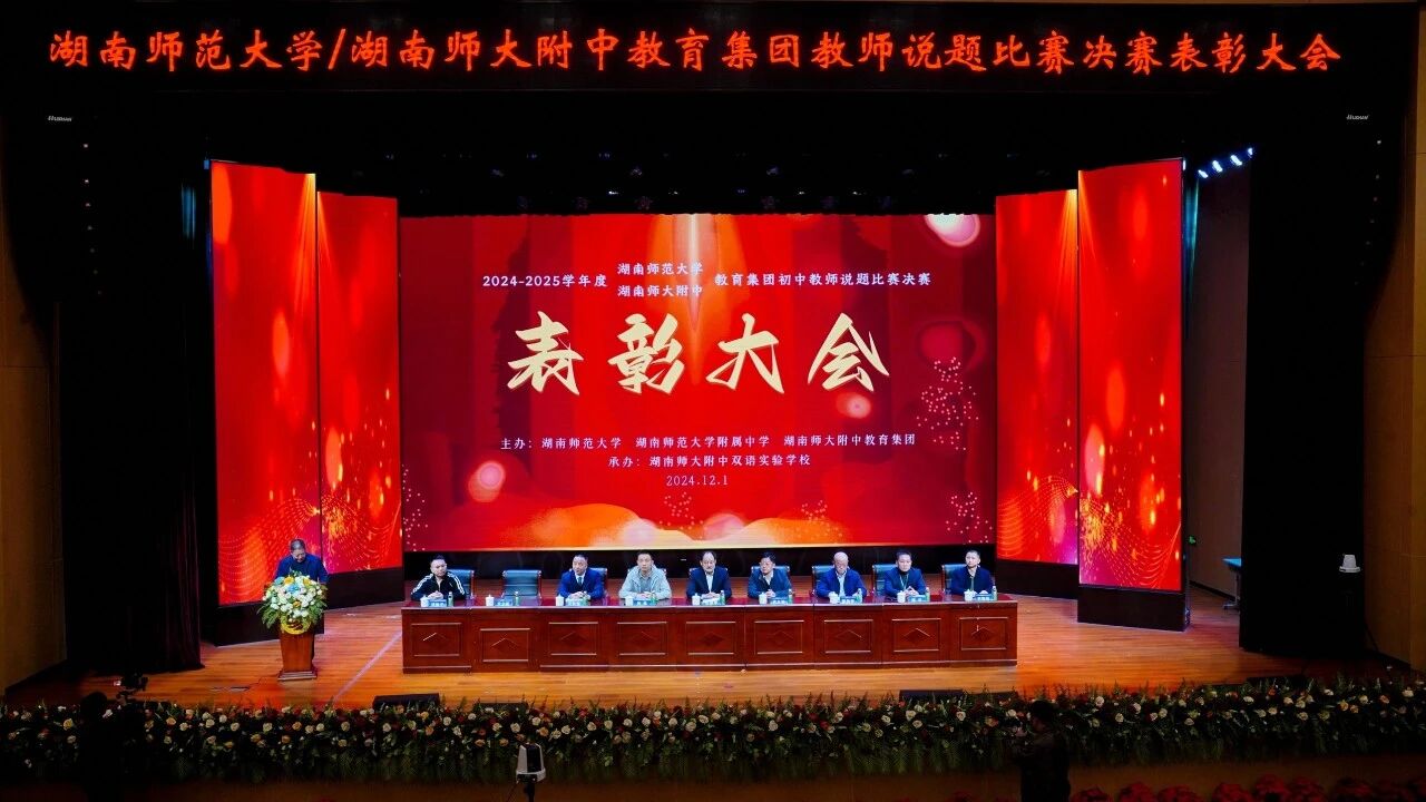 总结赛事,激发动力。表彰大会于当日18:00在南校区惟美厅举行,湖南师大附中教育集团办主任李文昭担任主持。湖南师大附中双语教育集团总校长、湖南师大附中双语实验学校党总支书记陈益代表学校致辞,对湖南师范大学及湖南师大附中教育集团的引领和支持致以感谢,对说题比赛的重要意义表示肯定。湖南师范大学数学与统计学院教授袁智强阐述多维评分维度。湖南师大附中党委委员陈胸怀逐一揭晓获奖名单,与会领导为获奖教师颁发证书。湖南师范大学基础教育发展中心主任蔡炳华指出本次说题比赛是一个思维碰撞、交流探讨的学习机会,愿其他教师对标优秀找差距,为提升教育教学技能积蓄力量。湖南师大附中校长黄月初围绕“团聚与奉献”等话题进行总结,立足于教学实践新态势,明确集团教育发展路径及方向,对各集团校的领导与教师予以殷切希望。