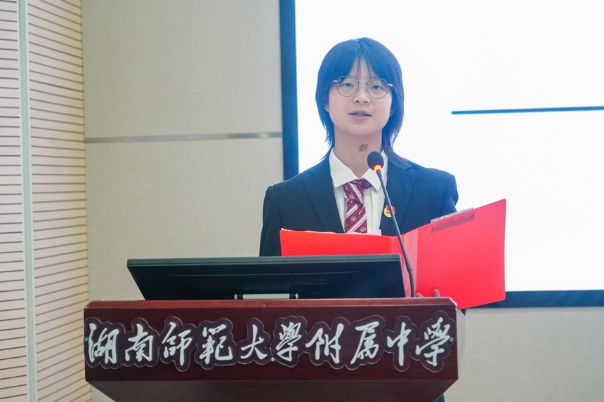 新团员代表罗子睿同学发言。他表达了对团组织的感谢,代表全体新团员郑重承诺做橘子洲头中流击水的弄潮儿,继承优秀传统,不负先辈嘱托,传递革命情怀,在春风里、在红旗下奔跑,拥抱青春。