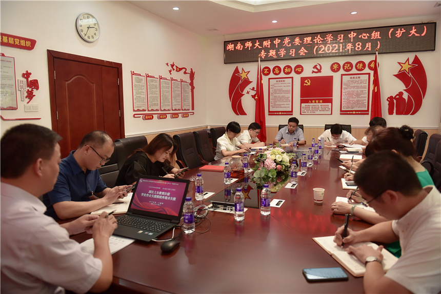 8月28日,湖南师大附中党委理论学习中心组(扩大)专题学习会召开,党委领导班子、党委办公室正副主任、党(总)支部书记、团委书记、少先队大队辅导员等参会,会议由党委书记黄月初主持。