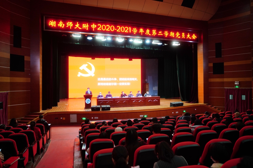 3月12日下午,我校2020—2021学年度第二学期党员大会在学生活动中心召开。党委书记、副校长黄月初,党委委员、校长谢永红,党委副书记彭荣宏,党委委员、副校长陈迪勋,党委委员、副校长苏建祥,党委委员廖强、陈胸怀等领导在主席台就座。本部全体在职教职工党员、离退休党总支、湖南广益实验中学党总支成员及支部书记共230余人参加会议。会议由彭荣宏主持。