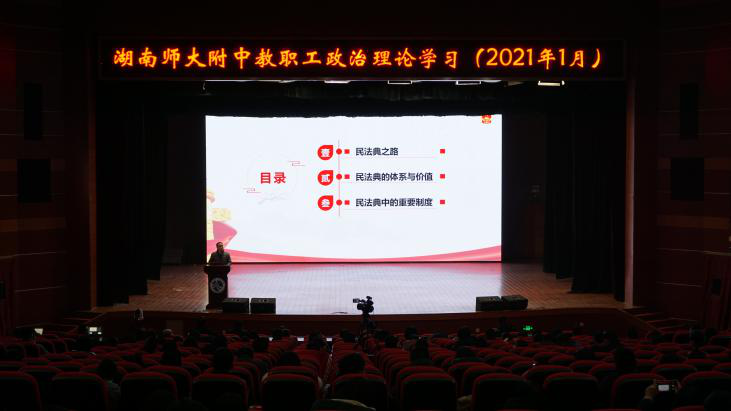 1月30下午,为准确理解掌握《民法典》的核心要义,更好推动《民法典》的实施,将《民法典》真正运用到我们的日常工作中,学校专门开展教职工政治学习,请到湖南省法学会破产法学秘书长、民商法学会理事,武汉大学民商法学博士、德国萨尔大学访问学者、湖南师大法学院讲师张永兵博士,以《<中华人民共和国民法典>解读》为主题为全校教职工解读《民法典》。学习活动严格按照疫情防控要求在学生活动中心举行,由党委办公室主任伏炎安主持,全校教职工按时参加。