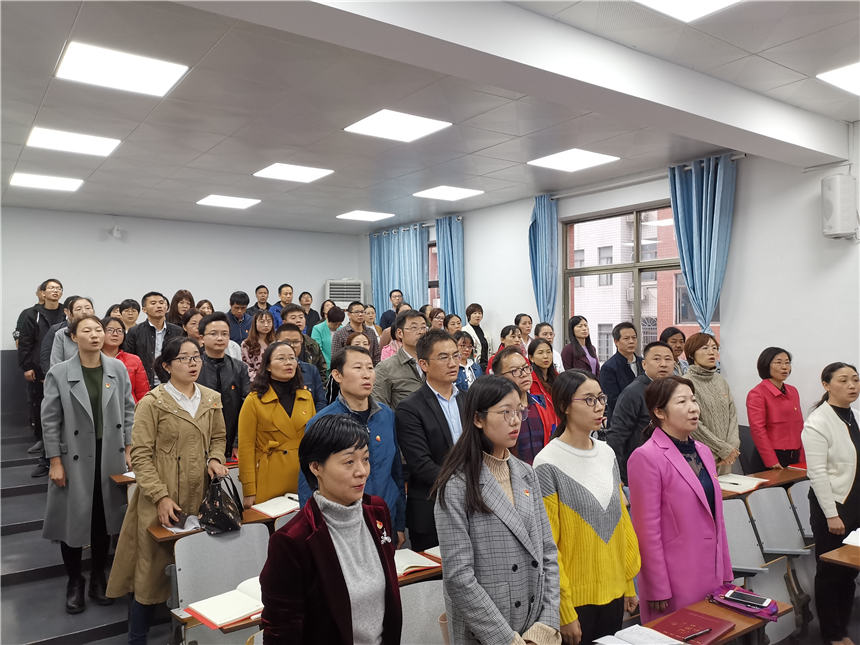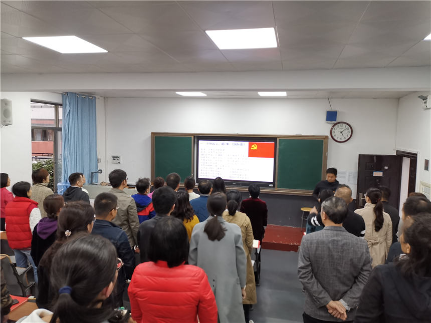 10月17日下午,2017级,2019级,联合教研党支部在科技楼二楼第二多功能厅召开了“讲故事 悟初心 担使命”主题党日活动,李春莲书记主讲党课,高一、高二、联合教研党支部党员老师参加。本次会议由高一支部书陈兵同志主持。