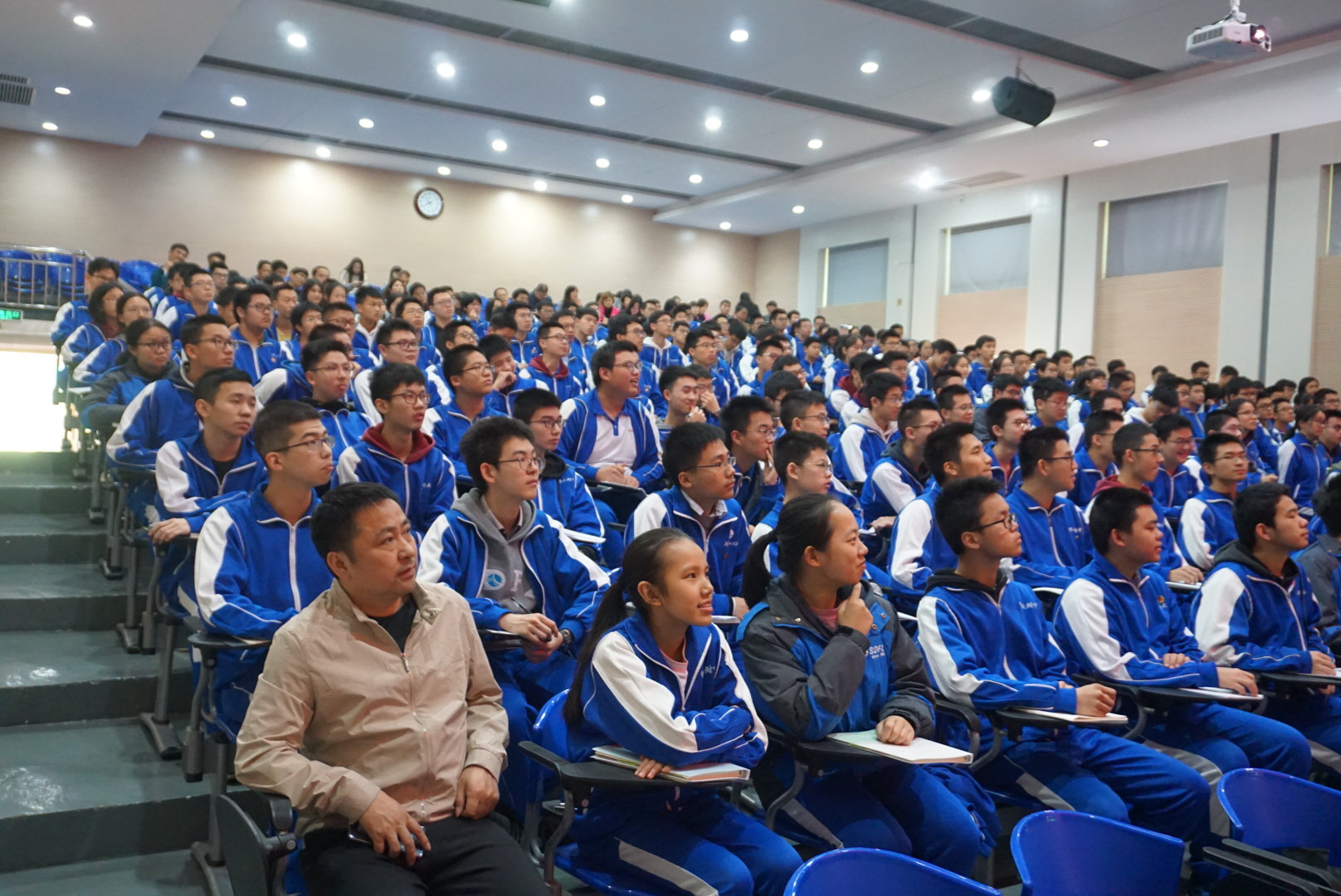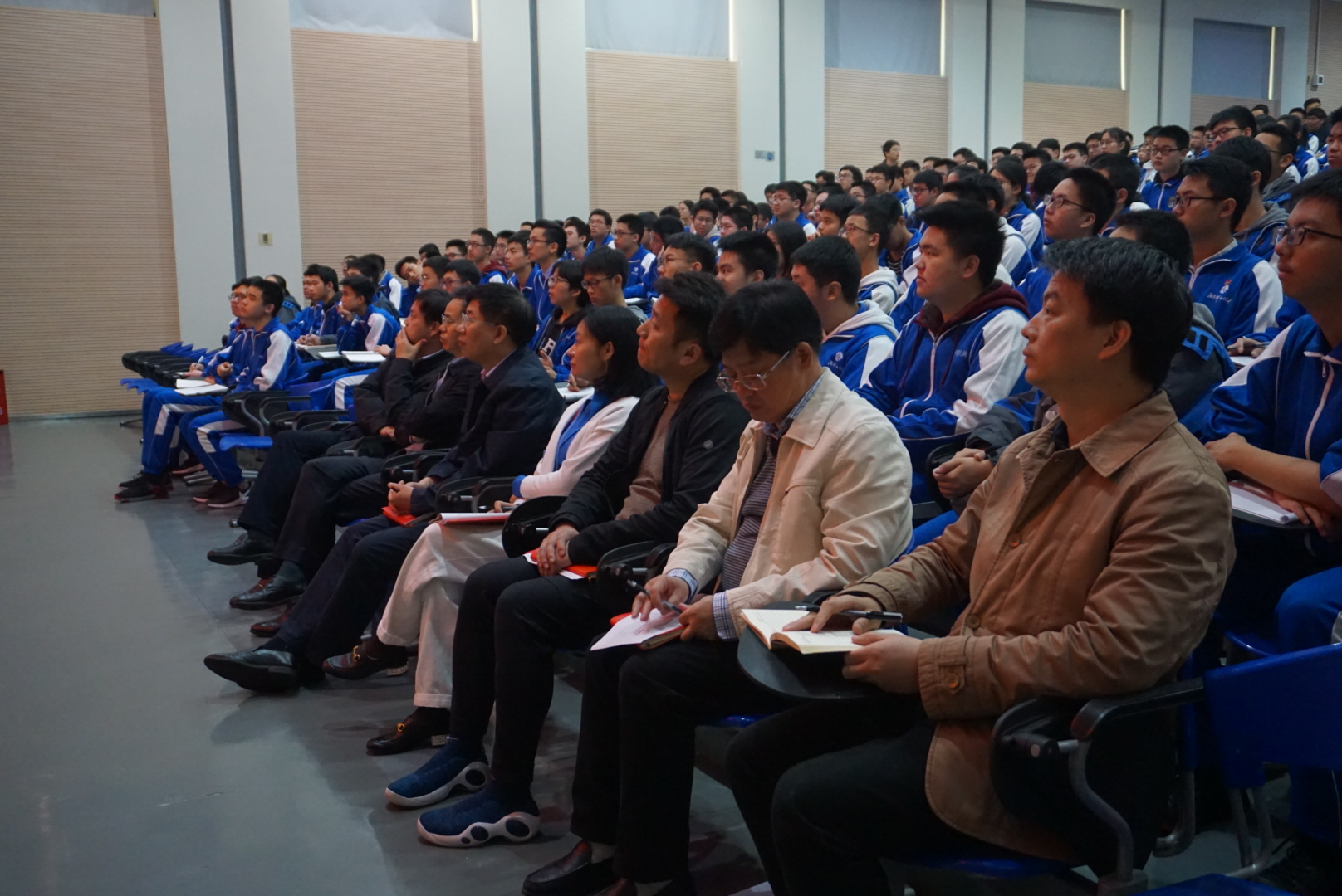 我校师生员工热切关注大会盛况,党委理论学习中心组成员、教职员工及两百多位青年学生代表在学校会议厅集体收看,认真学习领会大会精神。