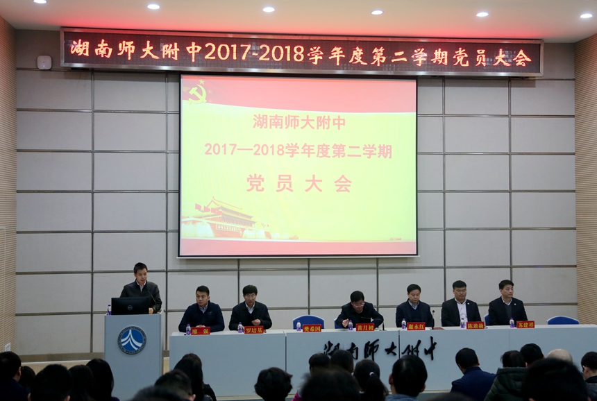 3月9日下午, 学校2017—2018学年度第二学期第一次党员大会在会议厅举行。党委书记、副校长黄月初,党委委员、校长谢永红,党委委员、副校长樊希国、陈迪勋、罗培基,党委委员、校长助理苏建祥,党委委员、校长助理、湖南广益实验中学校长廖强等在主席台就座。校本部近200名在职教职工党员和广益实验中学党总支委员、党支部书记及离退休教职工党员代表参加会议。会议由樊希国主持。