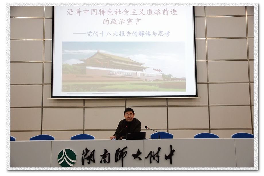 12月11日下午,我校学习党的十八大精神报告会在会议厅举行,教育部、人教社新课程教材培训专家,湖南省、长沙市中学政治教学专业委员会理事,我校政治教研组黄治清老师作了题为“沿着中国特色社会主义道路前进的政治宣言”的报告。报告会由校党委书记曾少华主持,全校教职工参加了报告会。在报告会上,黄治清老师从十八大召开的时代背景、十八大报告的基本精神和十八大报告的新思想新观点新举措等方面全面解读了十八大的精神,使全校教职工对党的十八大精神的理解和认识得到进一步提高。