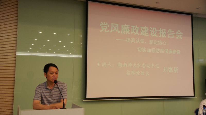 为进一步加强党风廉政建设宣传教育工作,按照师大纪委的相关文件要求和学校党委中心组的学习计划,6月30日下午,我校邀请了师大纪委副书记、监察处处长刘德新作了题为《提高认识,坚定信心,切实加强防腐倡廉建设》的党风廉政建设报告,报告会由党委书记曾少华主持,学校中层以上干部、年级组长、支部书记、工会组长和财务人员参加了报告会。