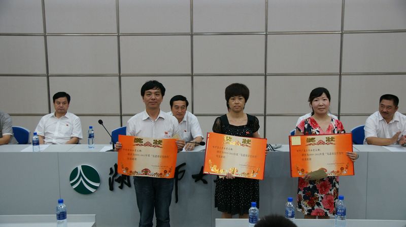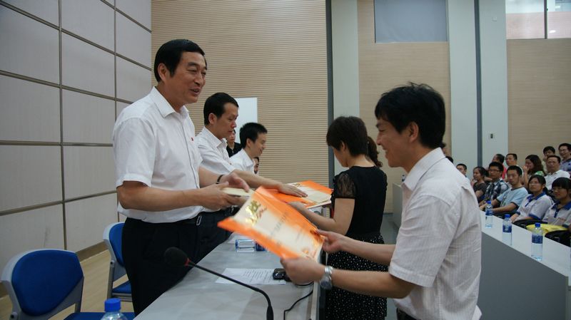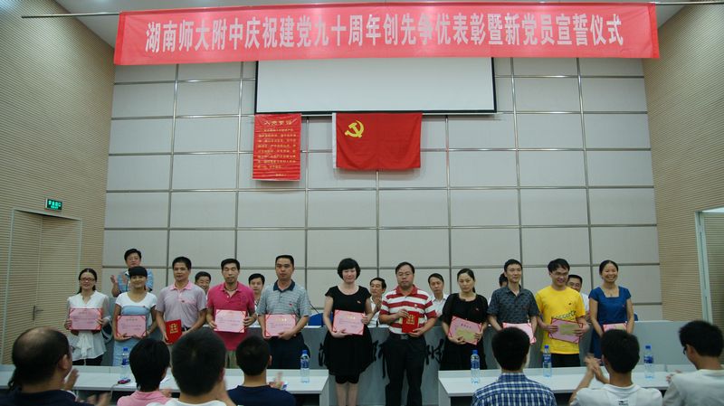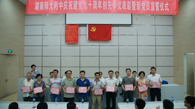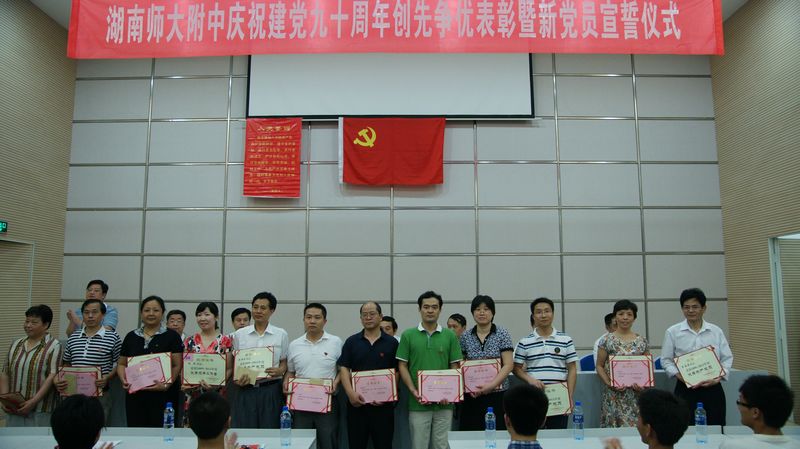 校党委委员、副校长樊希国宣读了《湖南师大附中关于2009—2011年度“先进基层党组织”、“优秀共产党员”、“优秀党务工作者”的表彰决定》。广高三年级党支部等3个党支部荣获“先进基层党组织”称号;朱孟德等32位同志荣获“优秀共产党员”称号;陈兵同志荣获“优秀党务工作者”称号。学校领导向受表彰的优秀个人和先进基层党组织颁发了荣誉证书和奖金。优秀共产党员代表、附高三年级党支部书记朱孟德老师结合年级支部工作和自身的学习、工作实际作了交流发言,表达了对党90岁生日的美好祝愿!