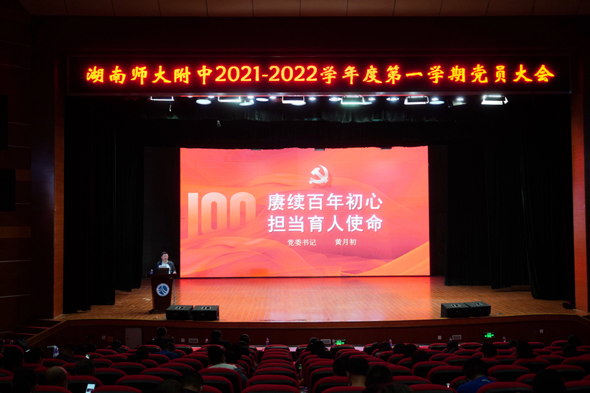会上,党委书记黄月初以《赓续百年初心,担当育人使命》为主题,向全体党员做党委工作报告,他总结上学期党委工作实效,对本学期党建工作作出部署,他在报告中重点介绍了本学期工作目标:深化党史学习教育,持续开创新局面;加强师德师风建设,铸牢新时代教育信仰;狠抓校园文明创建,打造品牌学校形象;严守纪律红线,做好党委、党支部换届;落实“四新”工作,建功“十四五”开局之年等。