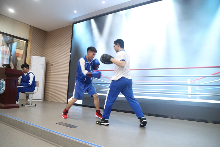 郑洪开老师带领1902班同学展示了《红心向党·继往开来》。通过“学时代榜样,以立小我之志”“学校友之光,以立大我之志”“传承红色基因,我们在路上”三个环节,聚焦榜样力量,汲取校友之光,为未来生活聚力,教育学生肩负历史使命,坚定前进信心,立大志、明大德、成大才、担大任。