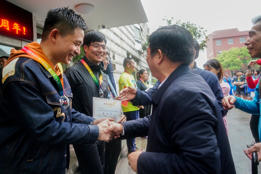 比赛顺利结束后,颁奖仪式在我校攀登广场举行。黄月初、陈迪勋、李春莲、苏建祥分别为取得成人组、学生男子组、学生女子组前8名的师生颁发证书和奖牌,并为所有完成了比赛的选手颁发纪念章一枚。