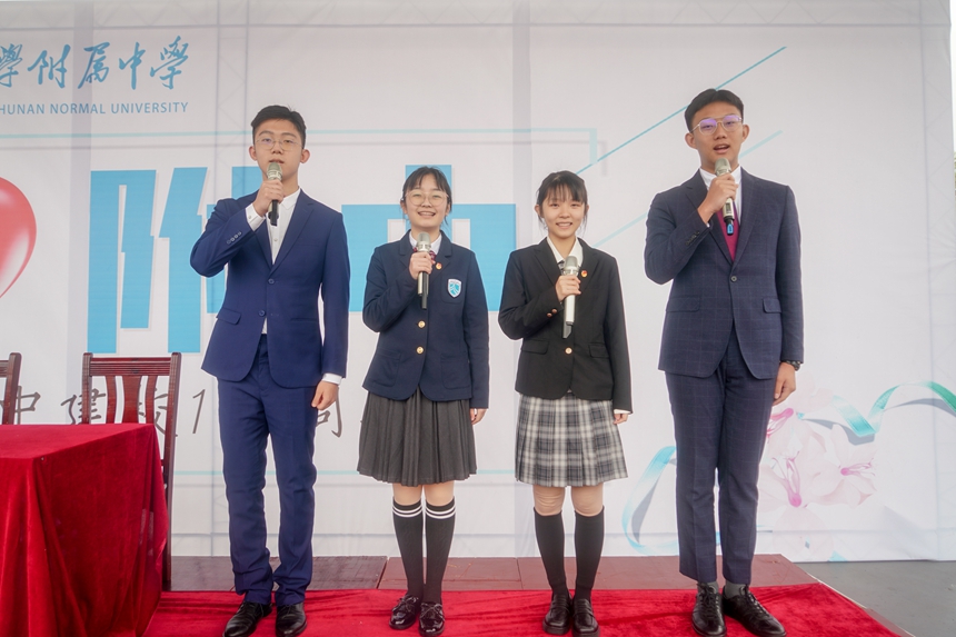 学生代表张祖凤、刘婷、袁闻骏、张巍耀朗诵了我校语文教研组组长欧阳荐枫老师的原创诗歌《征途》,为校庆献礼。