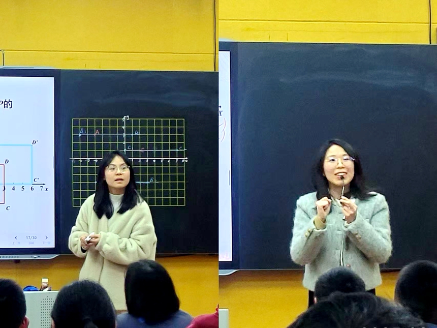 吴思洁老师以梅溪湖无人机为情景引入,引导学生探究将已知坐标的点经过向上、下、左、右的平移后对应点坐标的变化规律,总结出用坐标方法表示平移。让学生在知识生成的过程中,体会由特殊到一般的数学思想方法,感悟几何直观,通过代数获得数学表达的过程。吴老师既注重知识的传授,更强调数学思维的培养,符合新课标教学理念。柏雨薇老师以下中国象棋为情境引入课题,帮助学生回顾平移的概念与性质,进一步引导学生探讨图形平移点的坐标的变化规律。柏老师在探讨图形平移与坐标变化的关系时,利用信息技术让学生动态地移动图形,观察图形上关键点坐标的变化,归纳出平移与坐标变化的对应关系,营造了互动的学习环境,激发了学生学习热情,教学效果好。