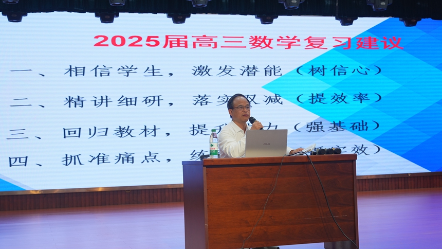 赵优良以《解析几何的教学思考与复习建议》为题作了专题讲座。他认为研究教考衔接从研究教材入手,从领悟教材编写意图、通过“主题”的拓展设计达成高阶思维、充分发挥教材特色栏目与习题的功能等三个方面阐述了教材在日常教学和高考中的重要性,为提高解析几何的教学与复习效率,建议老师们要深度研究高考真题,科学安排复习专题,注重提升学生思维品质,发展学生的学科核心素养。蒋荣清以《高考数学复习需要关注的七大问题》为题作了专题报告。蒋老师从备考内容和常见问题进行分析,提出高三复习备考策略:研究考情,明确方向;深耕教材,细研精髓;立足基础,固本强基;强化运算,精进技能;五、试卷讲评,力求精准;分类分层,以人为本;培养能力,发展素养。