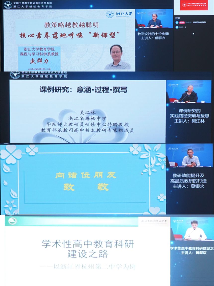 随后,浙江大学教育学院盛群力老师的《教学设计的十个步骤》、杭州市塘栖中学吴江林老师的《课例研究的实践路径突破与反思》、杭州第四中学莫银火老师的《教研效能提升及高品质教研的打造》、浙江省教育厅教研室主任任学宝老师的《课堂转型:为学习而设计,促进学生参与意义建构》、浙江大学心理与行为科学系陈树林教授的《教师心理压力调适与阳光心态》、杭州第二中学教育科研处主任黄犁欢老师的《学术性高中教育科研建设之路》、杭州市基础教育研究室书记朱可教授的《核心素养视域下的教研支撑作用》、杭州市西湖区教育发展研究院王曜君院长的《名师成长的关键要素研究》、浙江省教育厅教研室评价部主任方张松老师的《课堂教学质量评价和教学行为改进》等专题报告,通过云端迭次呈现,浙江大学继续教育学院为学员们精心设计、量身打造了一系列教育科研素养提升主题课程,让学员们眼界大开,茅塞顿开。