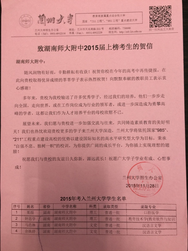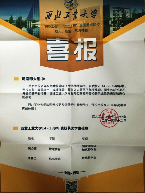 近日,西北工业大学、北京邮电大学、兰州大学先后发来喜报,祝贺我校优秀学子在高校取得的优异成绩,感谢我校的辛勤培育。