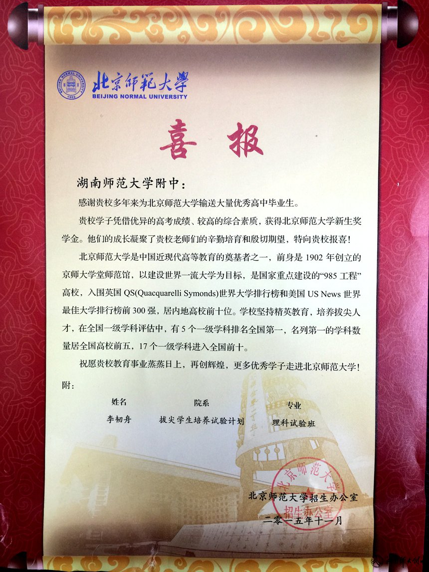 近日,北京师范大学给我校发来喜报,祝贺我校校友李韧舟同学荣获该校" 拔尖学生培养试验计划“奖学金。