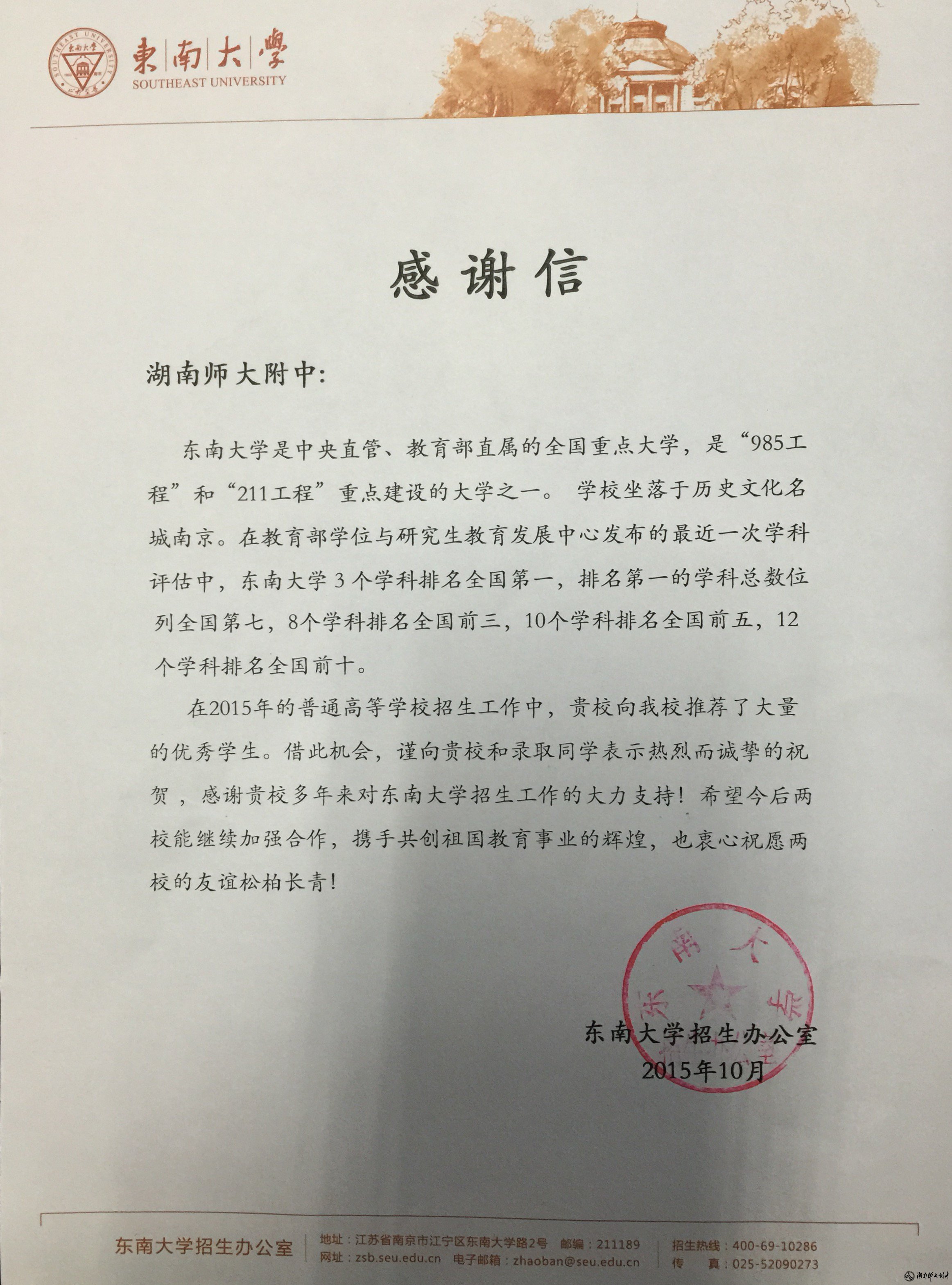 东南大学给我校发来喜报和感谢信