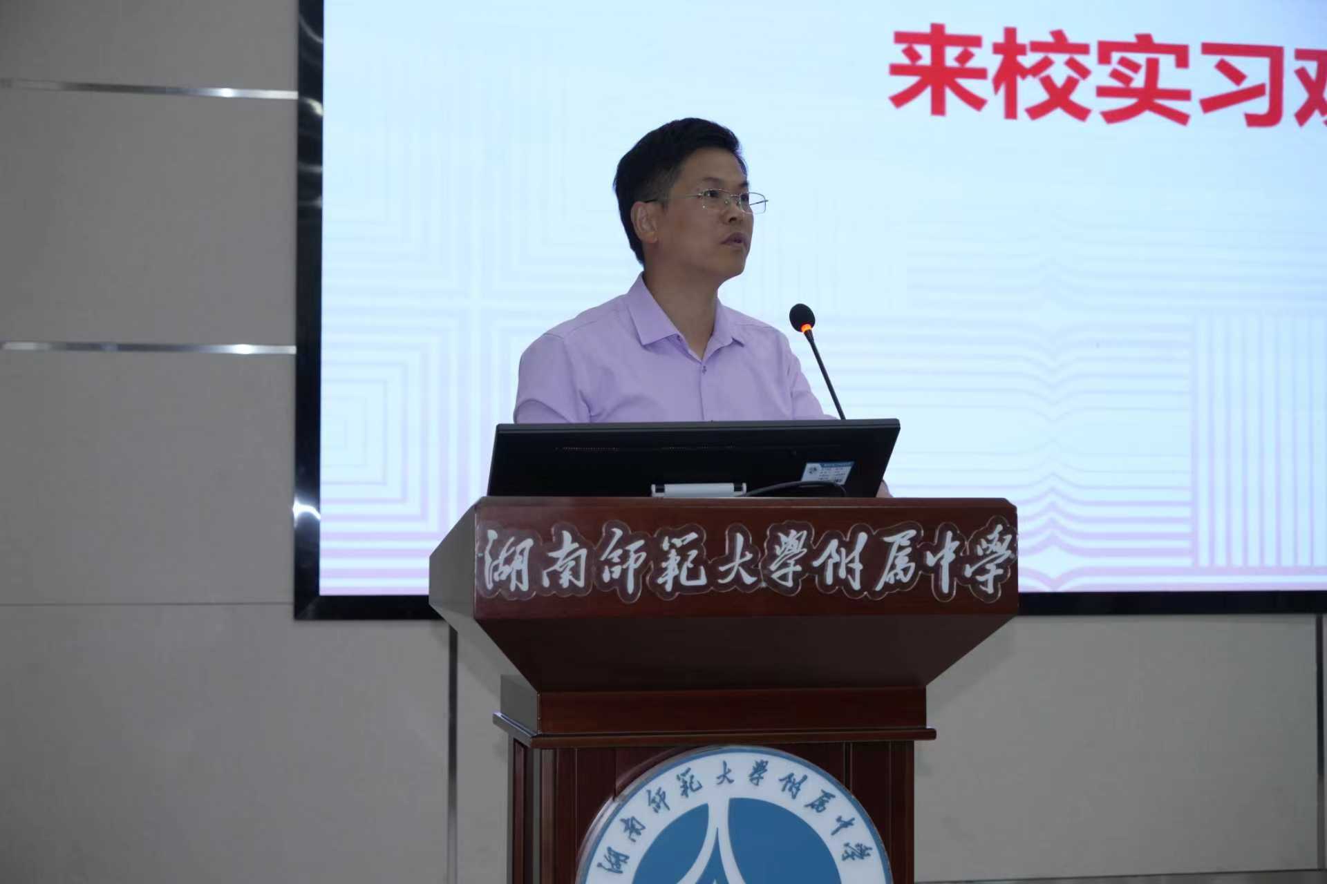 湖南师范大学历史文化学院刘利民院长发言强调,实习生需转变角色,做到“先当好学生再当好先生”;要认真对待实习,“站上讲台做好老师”;应严守纪律,“服从附中的规章制度”,以准教师的标准严格要求自己,不断锤炼自我。 带队老师代表谢圣英教授、陶明星主任从不同角度对实习生提出了期望。谢圣英强调实习生要“踏实做学徒、重视实习日志、完成角色构建”,陶明星主任则提醒实习生要“遵守规章、注意安全、积极沟通”。 实习生代表管娜、谢桢作表态发言。她们表示,将深刻认识实习的重要意义,主动提升教育教学管理能力,严格遵守实习纪律,争取在实习期间学有所获,为未来的教师职业发展积累宝贵经验。 苏建祥副校长首先向大家介绍了学校的“金牌摇篮”“教改先锋”“办学典范”“担当楷模”四张闪亮名片,让大家更进一步了解湖南师大附中。以“遇上好时代、选择好职业、进入好平台、抓住好机会”的“四个好”为切入点,鼓励实习生珍惜难得的实习机会,迅速完成从学生到教师的身份转变。同时对我校指导教师提出了“高标准、严要求、真指导、多协同”的四点要求,希望指导老师能全方位助力实习生成长,为他们的实习生涯筑牢基础。