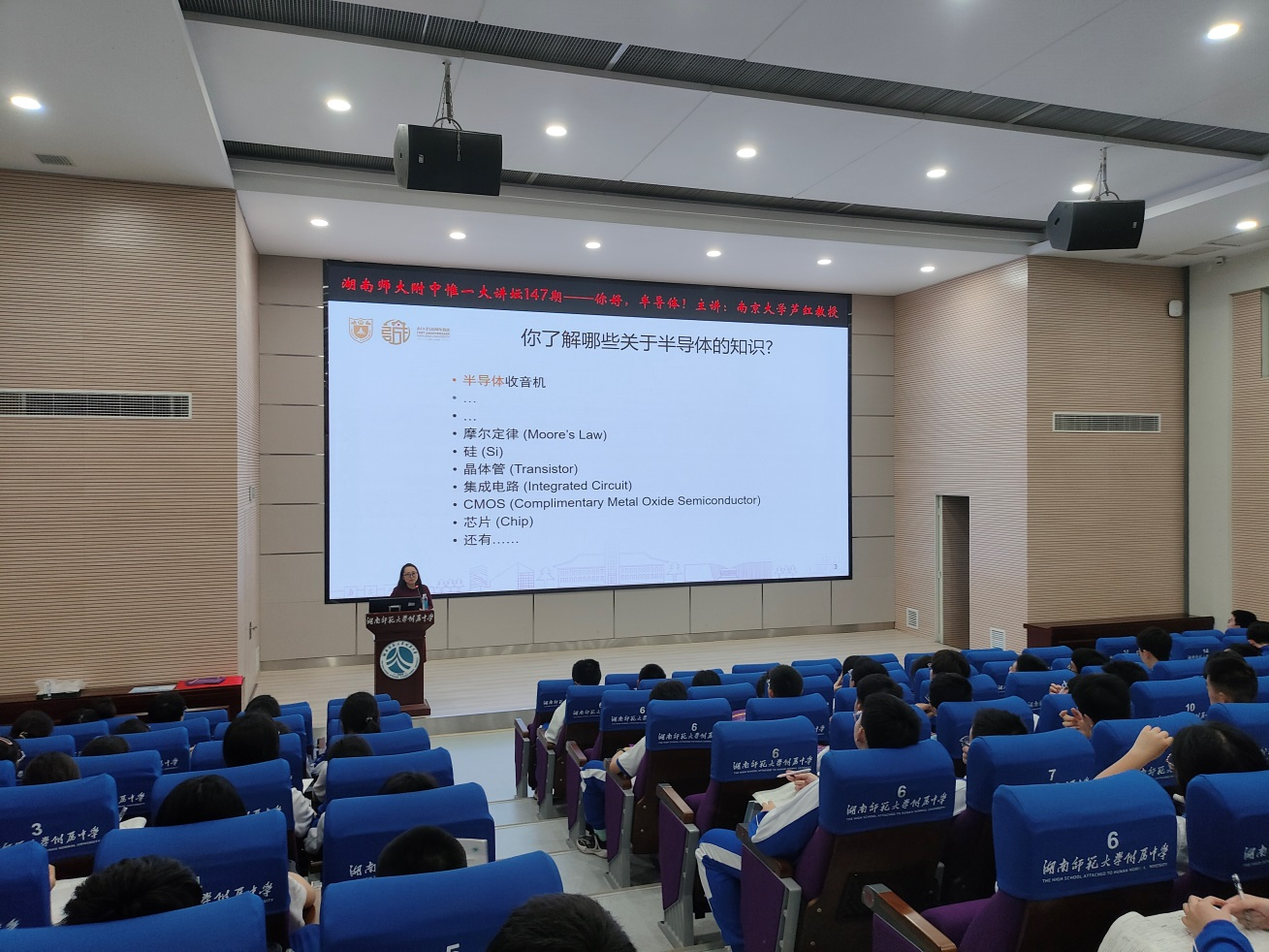 芦红教授以《你好,半导体!》为题和同学们进行交流,讲座过程中,芦红教授以通俗易懂的语言和丰富的图文资料,深入浅出地向在场学生介绍了人类发现半导体材料、研究半导体特性、探索半导体材料应用的历程,并介绍了我国半导体技术的发展现状以及未来的发展方向。