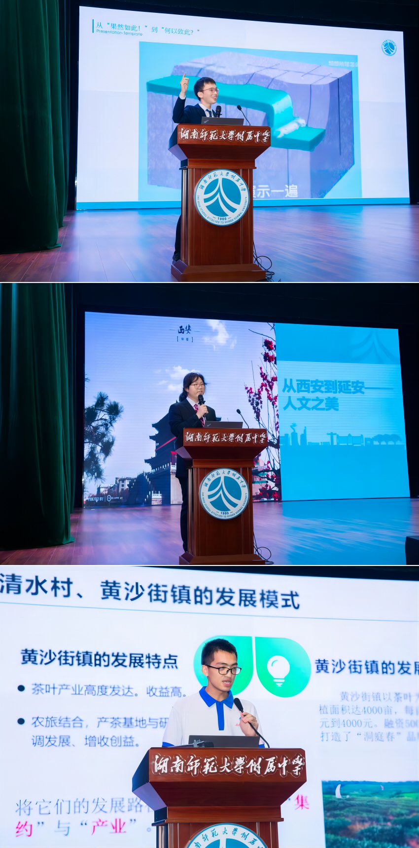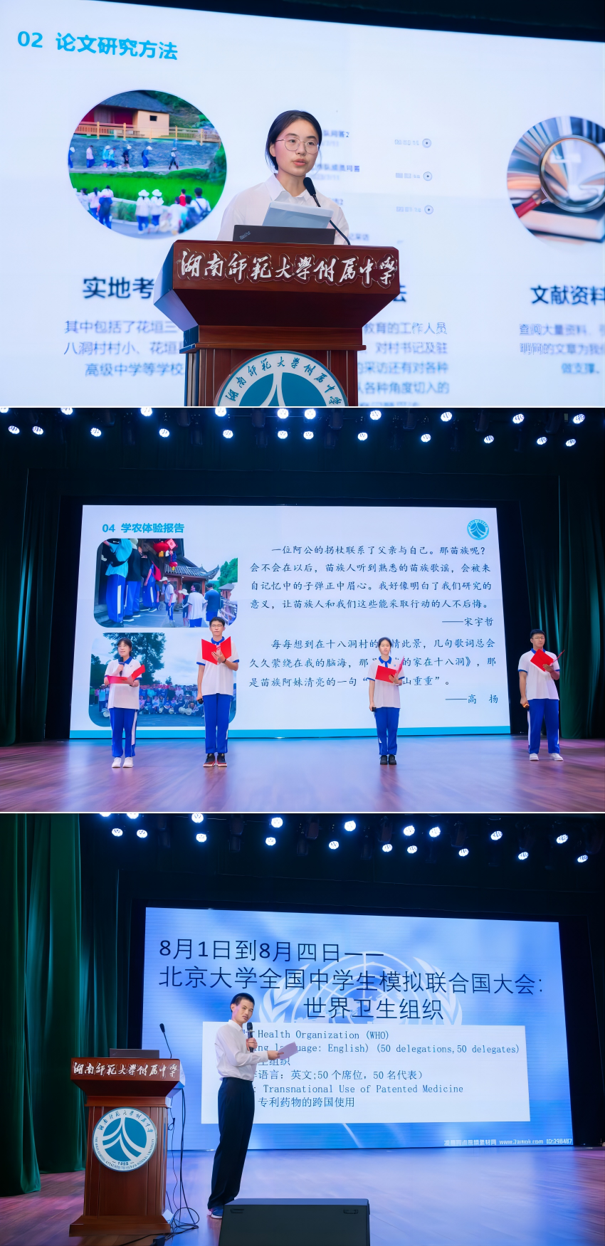 活动共安排八个项目团队集中汇报,这些成果是从2022-2023年综合实践课程的三百余项中成果中层层评选出来的,涵盖了农村实践调研、企业实践调研、野外研学考察、模拟联合国活动、国学夏令营及研究性学习等,涉及与中学学科知识紧密相关联的非遗文化、技术工艺、乡村振兴、政治法律、教育帮扶、环境保护等领域。