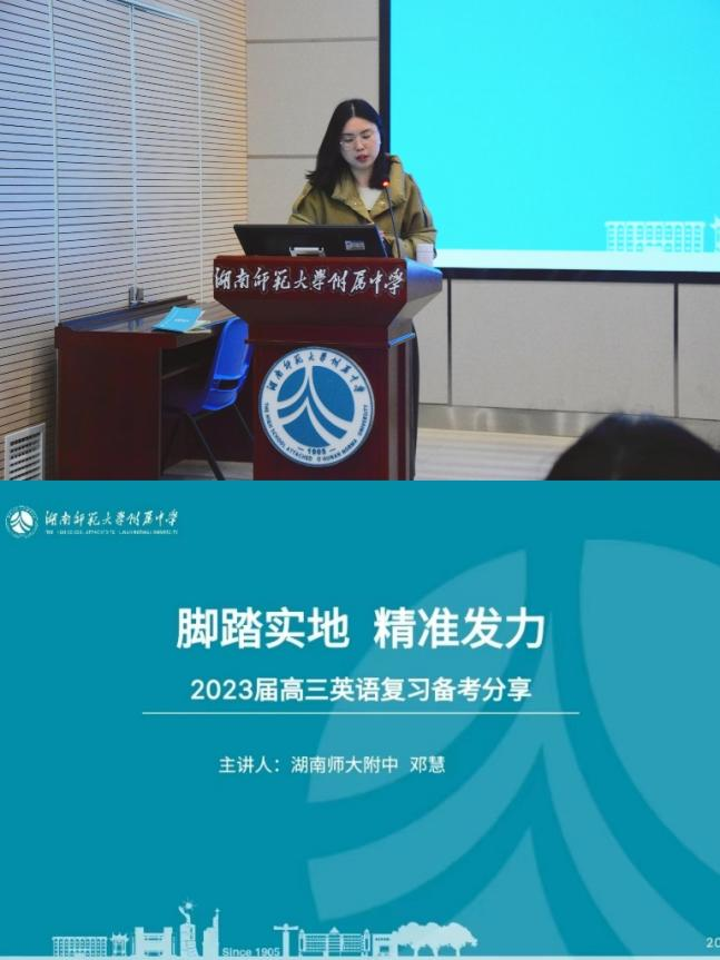 随后,邓慧老师开展了以“脚踏实地,精准发力”为主题的2023届高三英语复习备考分享讲座。她从常规教学和备考策略两方面出发,分享了附中本届高三英语备课组的一轮复习备考的思路,探讨了科学高效二轮复习的方法。