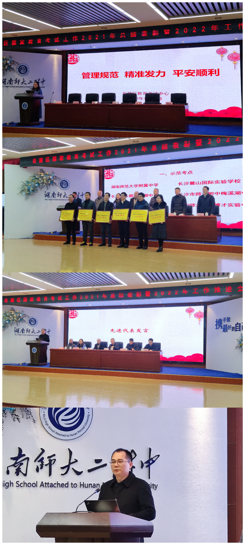 2022年1月10日,在湖南师范大学第二附属中学举行的岳麓区国家教育考试工作2021年度总结表彰暨2022年工作推进会上,我校荣获岳麓区2021年度教育考试工作“示范考点”荣誉称号,课程与教学处主任黄宇鸿荣获长沙市教育考试工作先进个人,课程与教学处副主任李勇荣获岳麓区教育考试工作先进个人,熊健等两位老师荣获岳麓区报名工作先进个人。黄宇鸿主任作为先进代表在会上分享了我校国家考试组考经验。