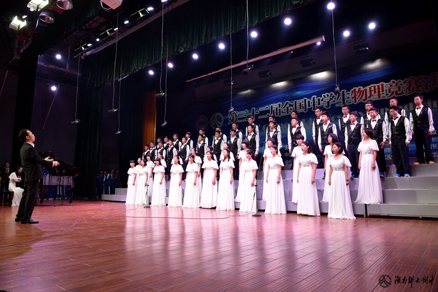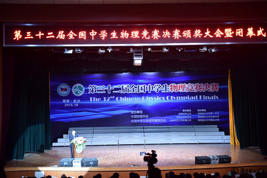11月5日上午,由中国物理学会、全国中学生物理竞赛委员会主办,湖南省物理学会、湖南师范大学和我校承办的第三十二届全国中学生物理竞赛决赛顺利闭幕。决赛颁奖大会暨闭幕式在我校学生活动中心举行。湖南省政协原副主席、中国科学院院士、湖南师范大学教授姚守拙,湖南省教育厅党组成员、省委教育工委委员王建华,湖南省科学技术协会副主席刘晓河,长沙市人民政府副市长何寄华,长沙市人民政府副秘书长厉江华,长沙市教育局党委书记、局长卢鸿鸣,湖南师范大学校长蒋洪新,竞赛组委会主任、湖南师范大学副校长匡乐满,全国中学生物理竞赛委员会名誉主任林纯镇、主任刘觉平、副主任陈晓林、常委潘正权和宋峰、办公室主任范淑兰,全国物理教学委员会秘书长王稼军、中国物理学会秘书长谷冬梅和我校校长谢永红、党委书记曾少华等出席了颁奖大会暨闭幕式。大会由湖南师大附中党委副书记彭荣宏主持。 颁奖大会在青春洋溢的《龙腾星城》舞龙表演中拉开帷幕。随后,一连串的歌舞表演引得观众目不暇接,现场高潮迭起,掌声不断。合唱《巴黎圣母院的敲钟人》节奏明快、激情昂扬;葫芦丝演奏《月光下的凤尾竹》场面盛大、富有韵味;爵士舞《Mr.Mr》摩登时尚、动感现代;民乐小合奏《奇迹》清新古典、底蕴丰厚。
