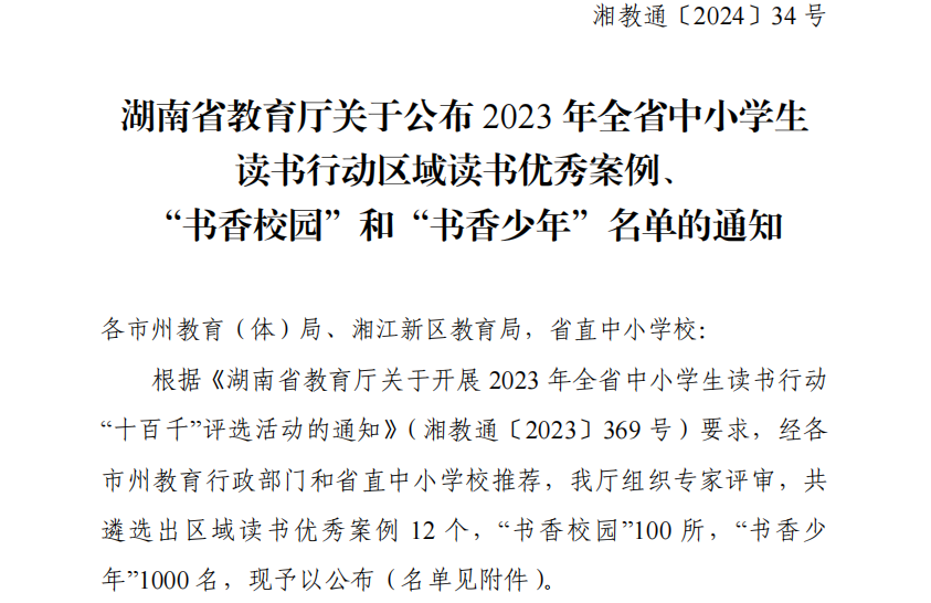 为贯彻落实党的二十大关于深化全民阅读活动的重要部署,进一步推动全省中小学生读书行动广泛深入开展,湖南省教育厅组织开展了2023年全省中小学生读书行动“十百千”评选活动。我校积极响应本次活动,组织师生如实填写申报材料,经各市州教育行政部门和省直中小学校推荐,湖南省教育厅组织专家评审,我校在“书香校园”“书香少年”两项项评选活动中脱颖而出。